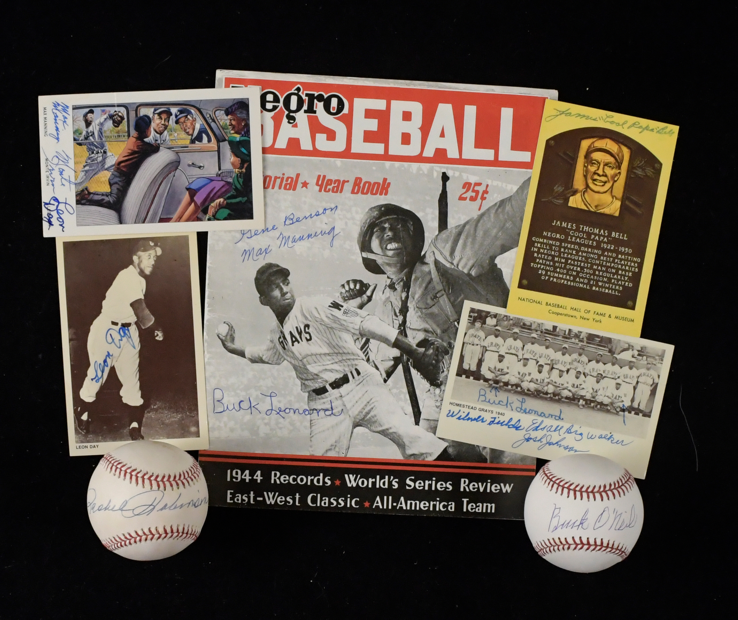 Description:Negro League autograph lot including Hall of Famers (VG-NM) Includes reproduction 1944 Negro Baseball publication which is signed on the cover by Buck Leonard, Gene Benson, and Max Manning; Rachel Robinson and Buck O'Neil single signed Rawlings B.Selig OML baseballs (light toning and some mild use/wear to Robinson ball); Cool Papa Bell signed HOF postcard; Ron Lewis art postcard signed by Monte Irvin, Leon Day, and Max Manning (some creasing); (7) single signed Negro League Legends postcards incl. Leon Day and Wilmer Harris; multi-signed cards from the same series incl. Leon Day/Al Wilmore/Leroy Ferrell, Buck Leonard/Wilmer Fields/Edsall Walker/Josh Johnson, and Bill Wright/Andy Porter. Signatures rate 7 to 9 out of 10. Light to mild scattered wear: VG-NM