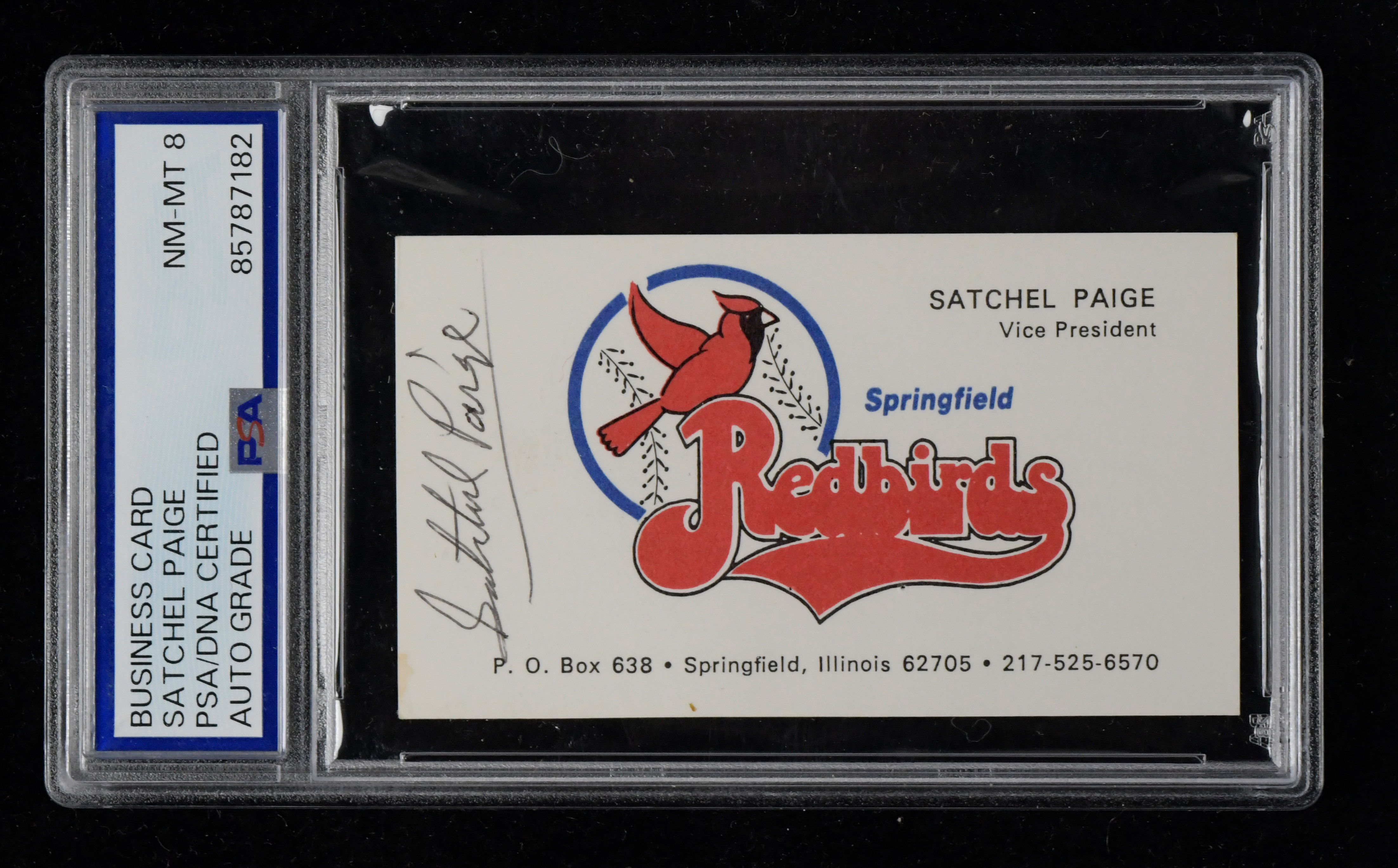 Description:Satchel Paige autographed Springfield Redbirds business card (PSA/DNA NM-MT 8) Signed in ink and there is a hint of light wear: PSA/DNA NM-MT 8