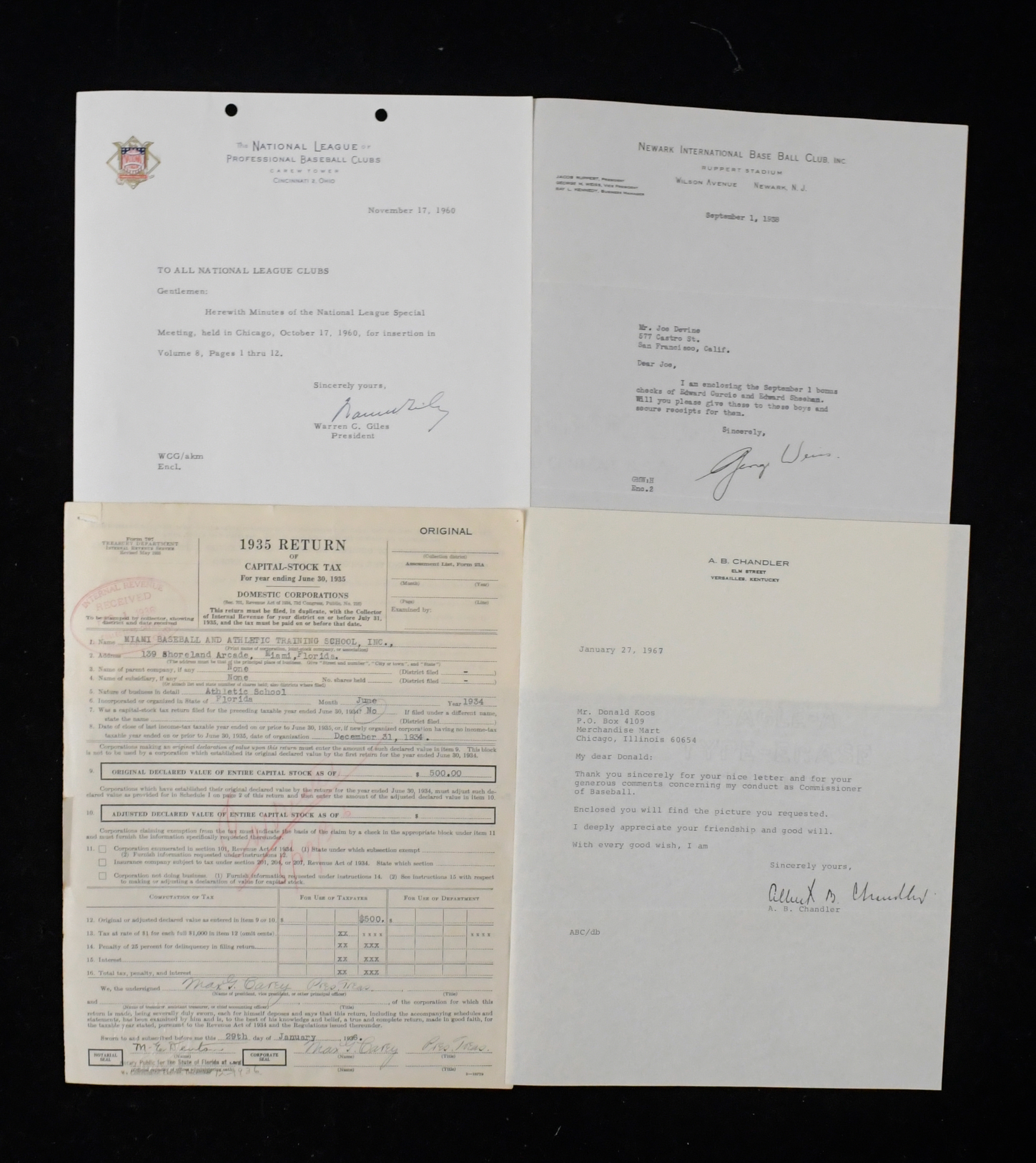 Description:Lot of (4) Baseball Hall of Famer autographed letters/documents (VG-EX/MT) Includes 1938 letter on Newark Base Ball Club stationary signed by George Weiss; 1960 letter on National League stationary signed by Warren Giles; 1967 letter on his personal stationary signed by Happy Chandler; and 1935 tax return document for the Miami Baseball and Athletic Training School signed twice by Max Carey. Signatures rate 7 to 9 out of 10. Light general wear with some more pronounced wear to Carey piece: VG-EX/MT