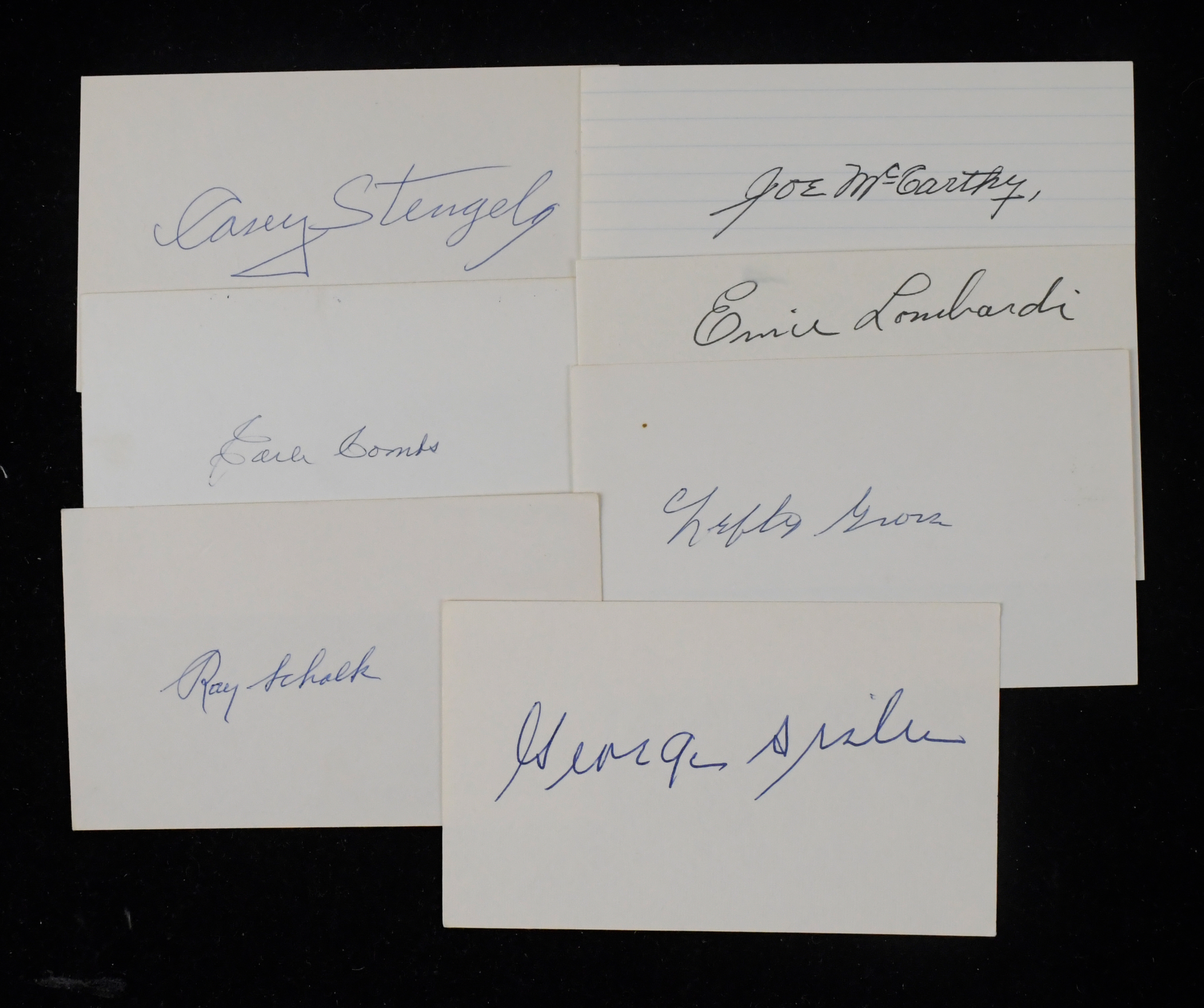Description:Lot of (7) Baseball Hall of Famer autographed index cards (EX-NM) Includes Casey Stengel, George Sisler, Ray Schalk, Lefty Grove, Ernie Lombardi, Joe McCarthy, and Earle Combs. Ink signatures rate 7 to 8/9 out of 10. Light toning: EX-NM