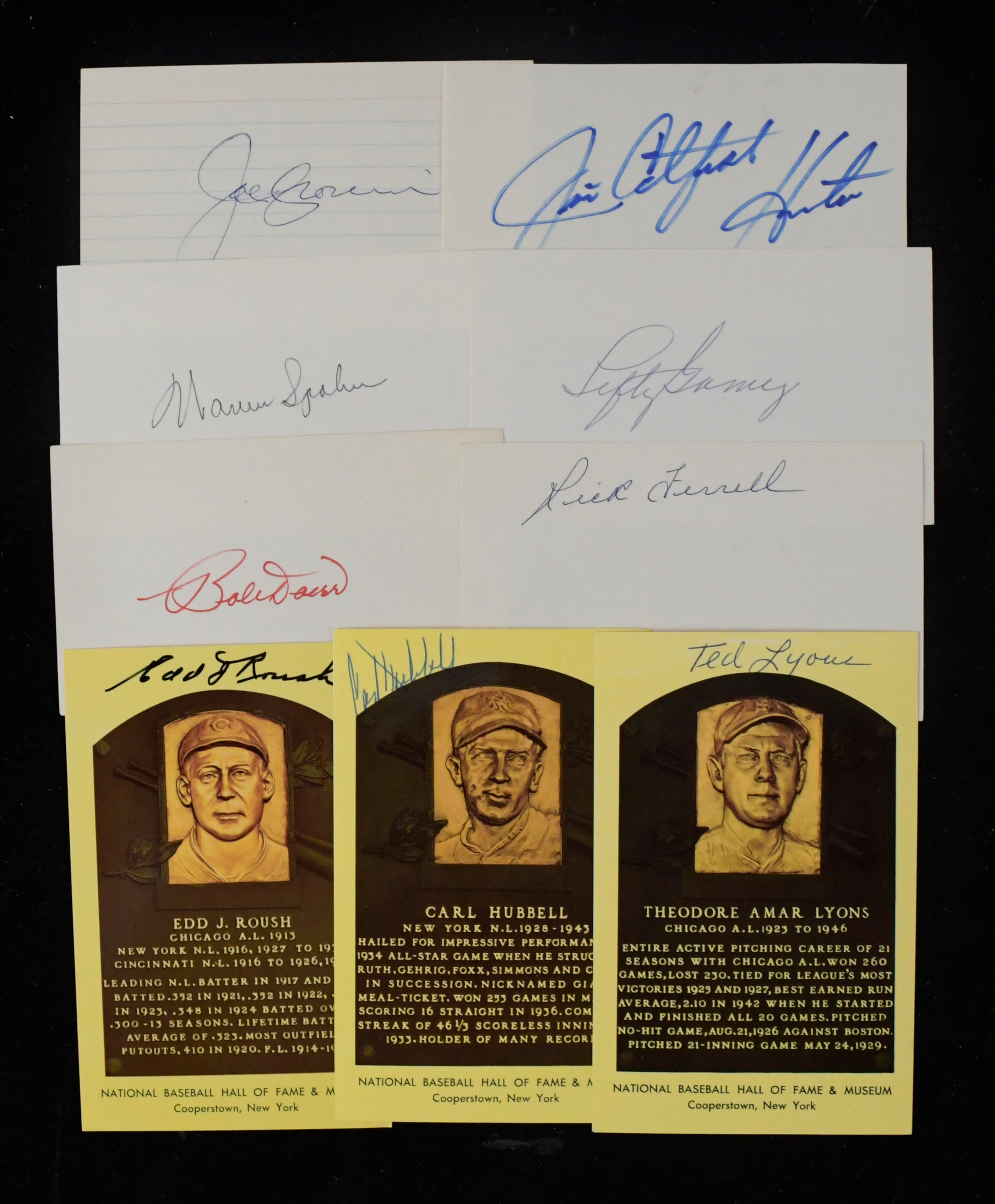 Description:Autographed lot of (8) yellow Hall of Fame and (6) index cards (VG-EX/MT) Includes HOF postcards signed by Jocko Conlan, Judy Johnson, Joe Sewell, Bill Terry, Lefty Gomez, Edd Roush, Carl Hubbell, and Ted Lyons; index cards signed by Joe Cronin, Rick Ferrell, Bob Doerr, Lefty Gomez, Warren Spahn, and Catfish Hunter. Signatures rate 7 to 8 out of 10. Light to moderate scattered wear: VG-EX/MT