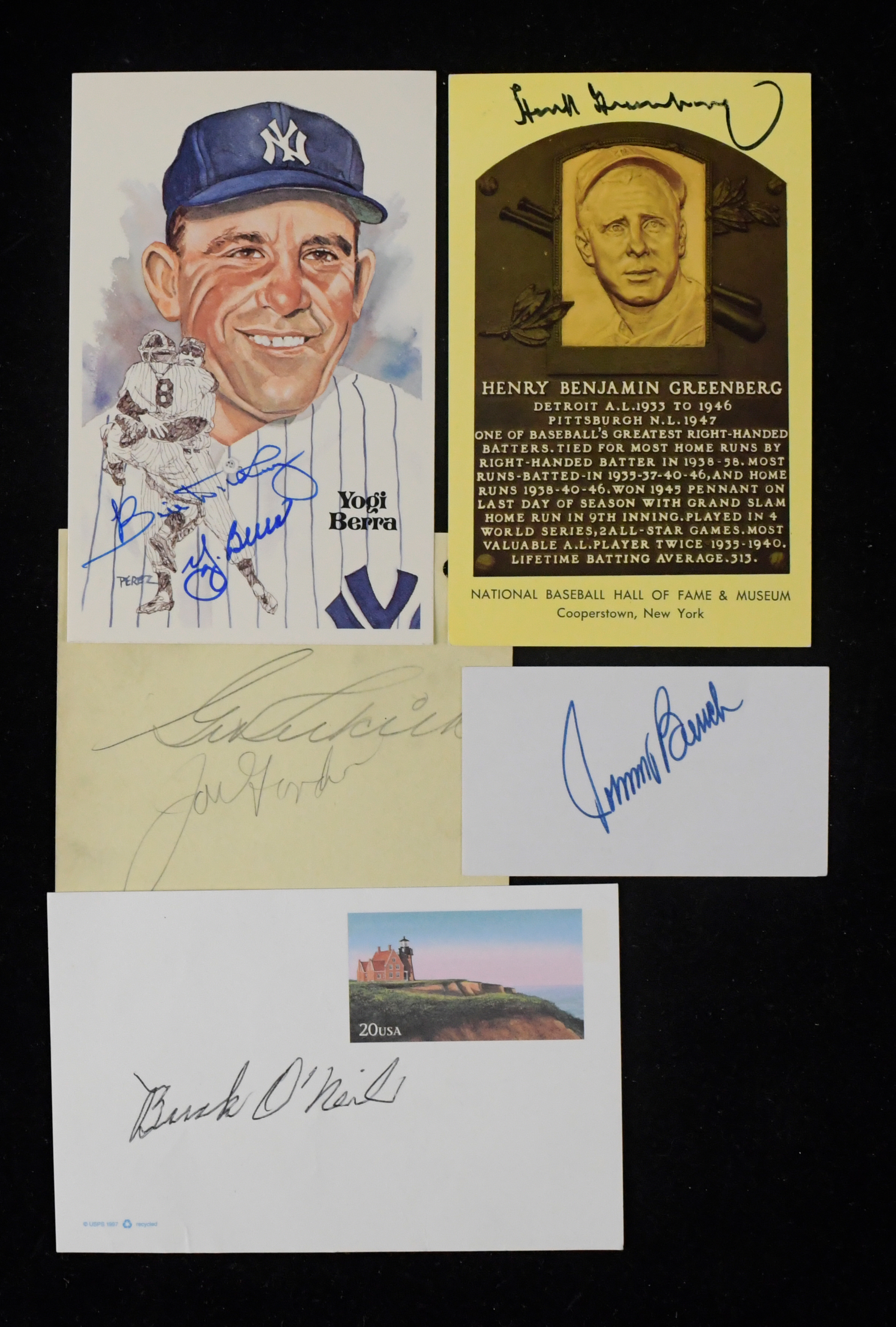 Description:Lot of (10) Baseball Hall of Famer autographed pieces incl. Greenberg and Joe Gordon (VG-NM) Includes Hank Greenberg signed Hall of Fame postcard; album page signed by Joe Gordon, George Selkirk, Frank Demaree, Jimmy Wallace (unknown exacty whom this is), and Howard Krist; album page signed by Phil Rizzuto, Joe Hoover, Dizzy Trout, and Jimmy Bloodworth; Joe Cronin signed small image of his Hall of Fame plaque; Johnny Mize and Earl Averill signed Shakey's Pizza cards; Johnny Mize signed real photo postcard; Yogi Berra Perez Steele postcard signed by Berra and Bill Dickey; Buck ONeil signed Gov't postcard; and Johnny Bench cut signature. Ink and marker signatures rate 7 to 9/10 out of 10. Light scattered wear: VG-NM