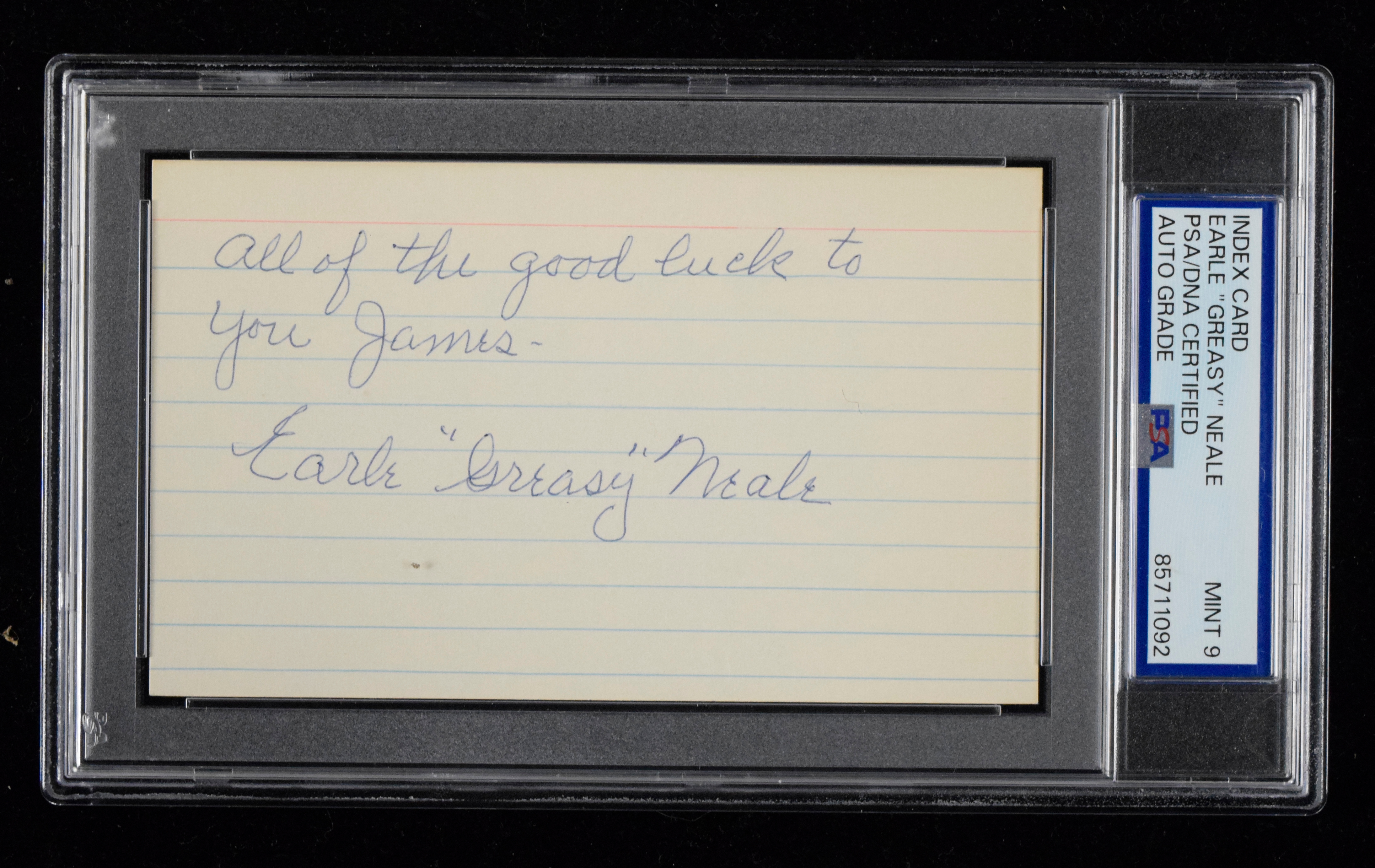 Description:Earle Greasy Neale autographed index card (PSA/DNA Mint 9) Signed in ink: PSA/DNA Mint 9
