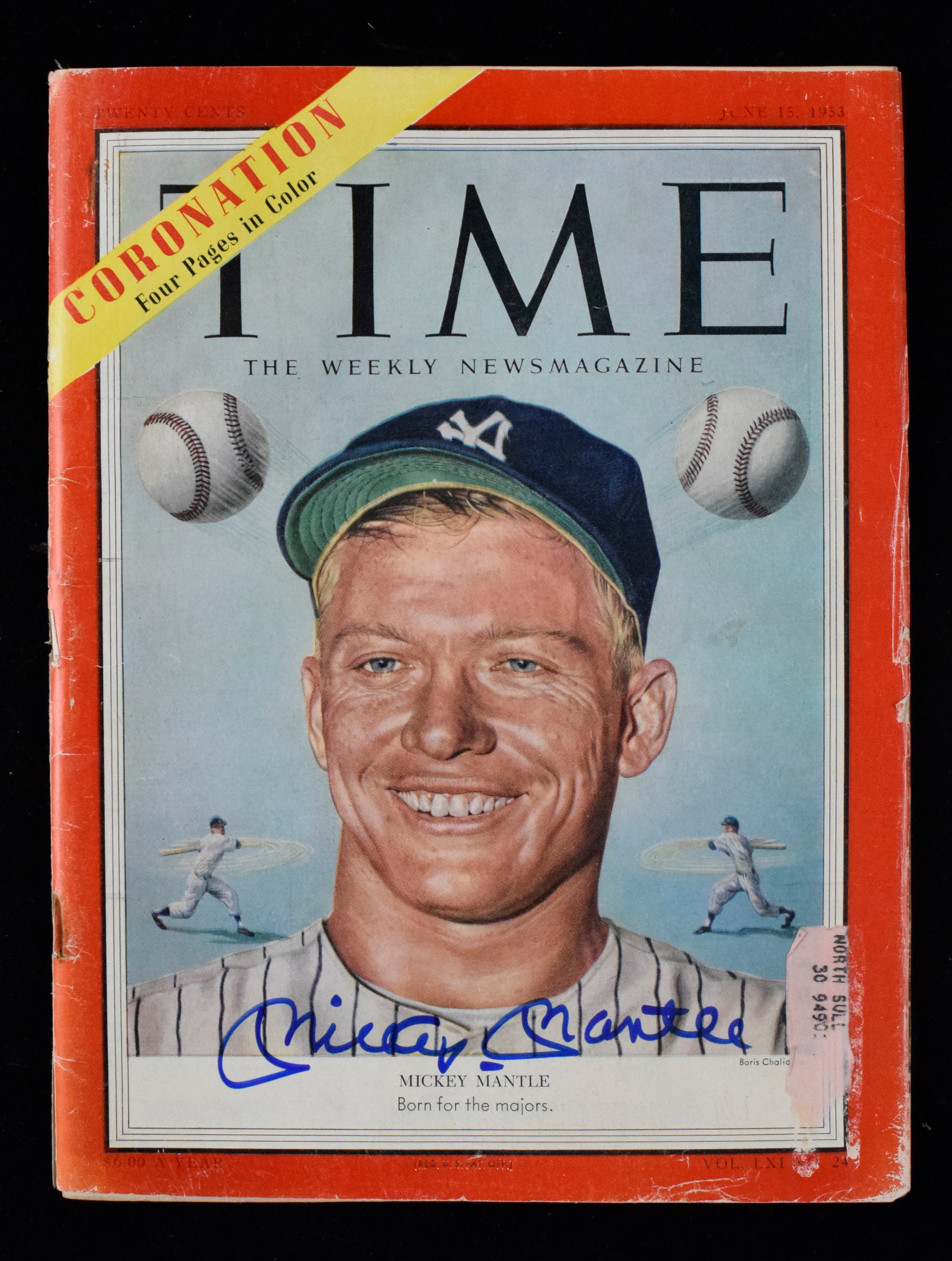 Description:Mickey Mantle autographed 1953 TIME Magazine (Sig. NM, Magazine GD) Signed in marker rating 9 out of 10. Scattered wear includes corner and edge flaws/tears. Partial mailing label affixed. Mild mildew/musty odor: Sig. NM, Magazine GD