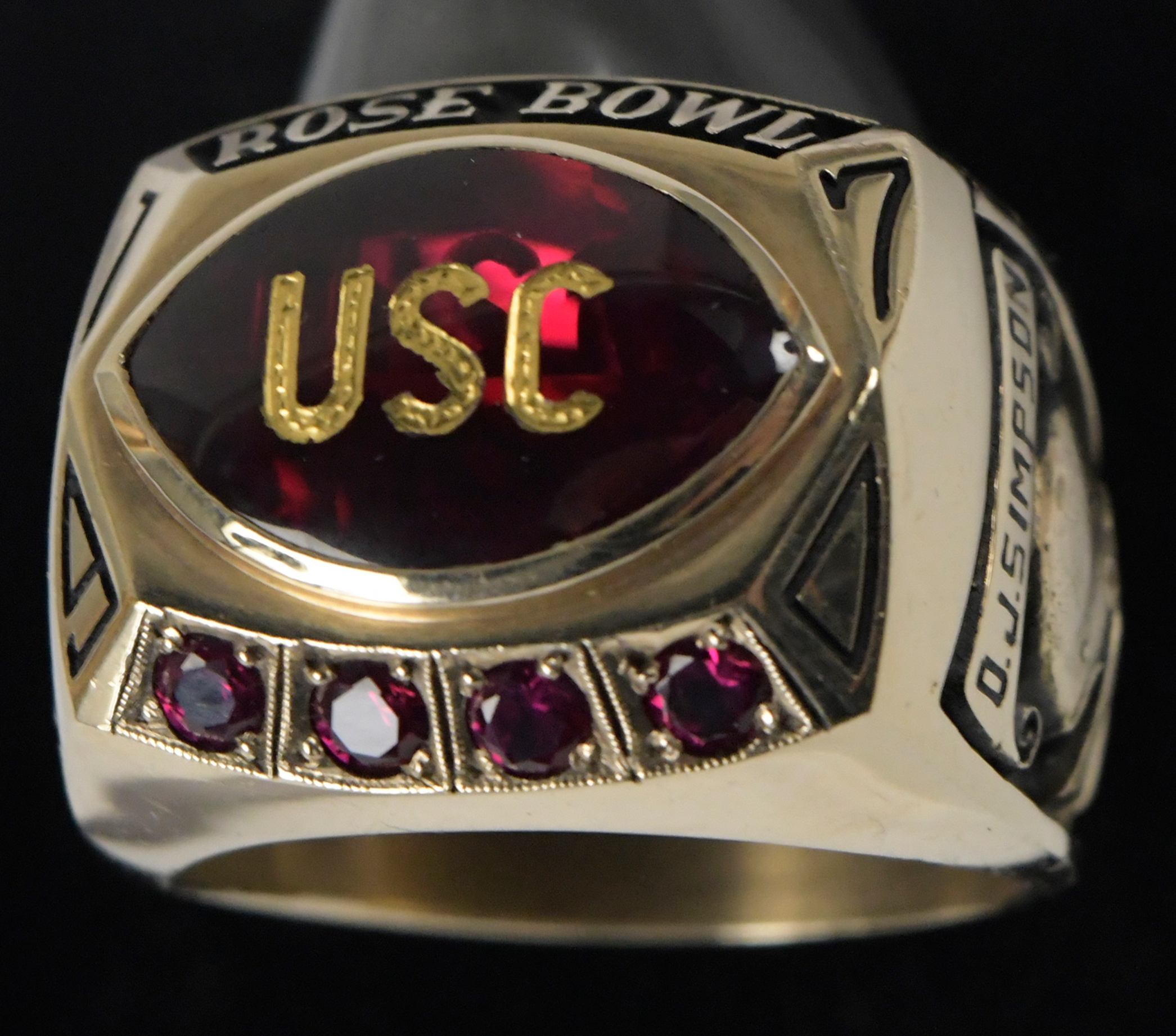Description:USC Trojans 1970 Rose Bowl 10K gold O.J. Simpson salesman's sample ring (NM). Size 11.5 ring weighing 1-oz. with "USC" on red stone face surrounded by "Rose Bowl" "19" "70" text. One side has "Trojans" above team logo, and the other has "O.J. Simpson" above a football helmet with "100" below. "BALFOUR 10K" and "SA 94463 - 1" can be seen on the inner band: NM ($2,000-$4,000)