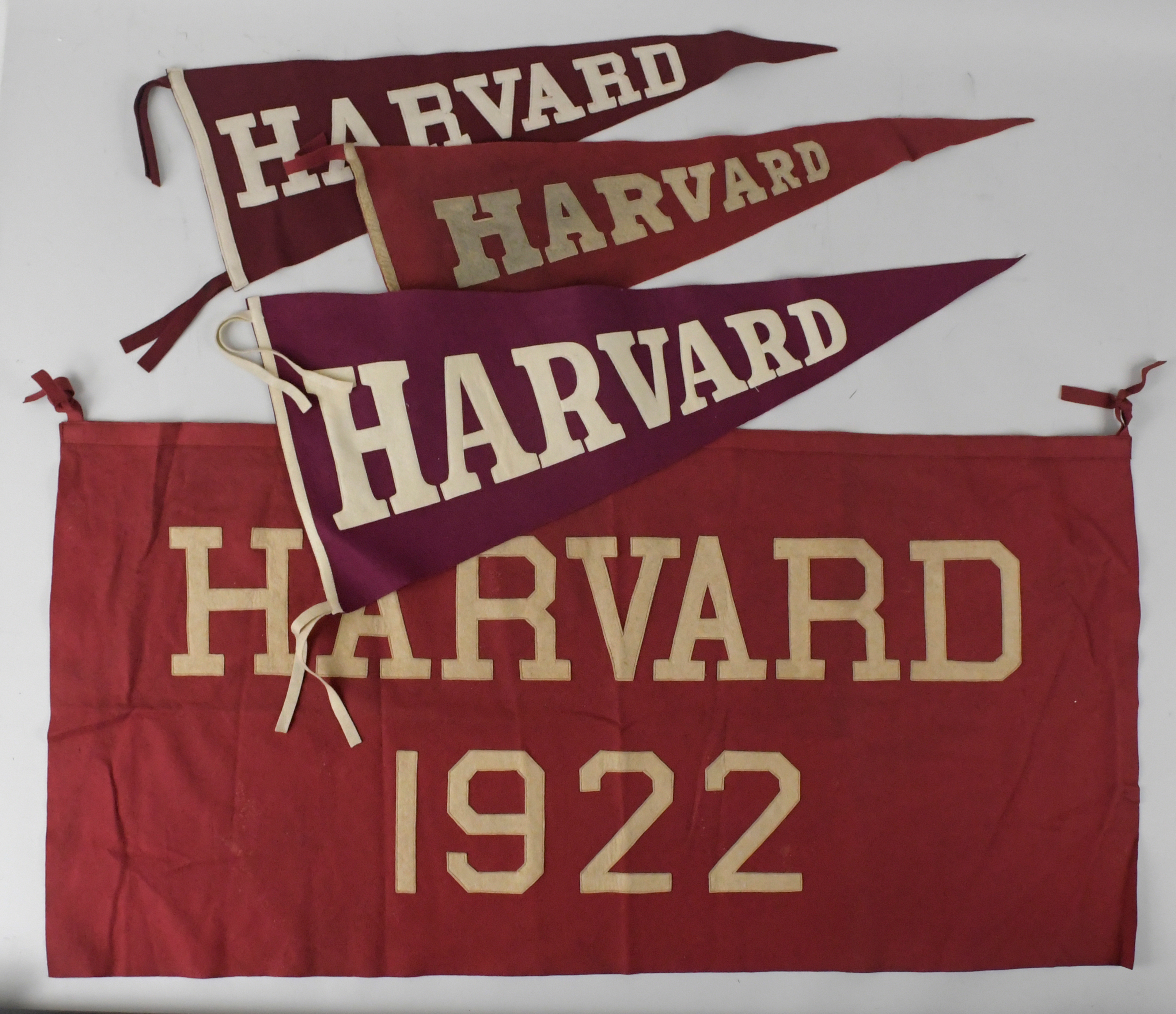 Description:Lot of (12) vintage Harvard banners, blanket, and pennants (VG-NM). Includes 39.5"x59.5" Harvard blanket, 23.5"x46" 1922 Harvard banner, 23"x47" New England College Banner Co. 1924 Harvard banner, 17.5"x33.5" Chicago Pennant Co. 1954 Harvard banner, 22.5"x45.5" Chicago Pennant Co. undated Harvard banner, 14"x26.5" Chicago Pennant Co. undated Harvard banner, 18.5"x38.5" undated Harvard banner, 14"x26.5" undated Harvard banner, 17.5"x34.5" undated Harvard banner (VG), 33" Harvard pennant, 29" Harvard pennant, and 28" Harvard pennant. Most appear to average EX-EX/MT overall. Range: VG-NM ($400-$600)