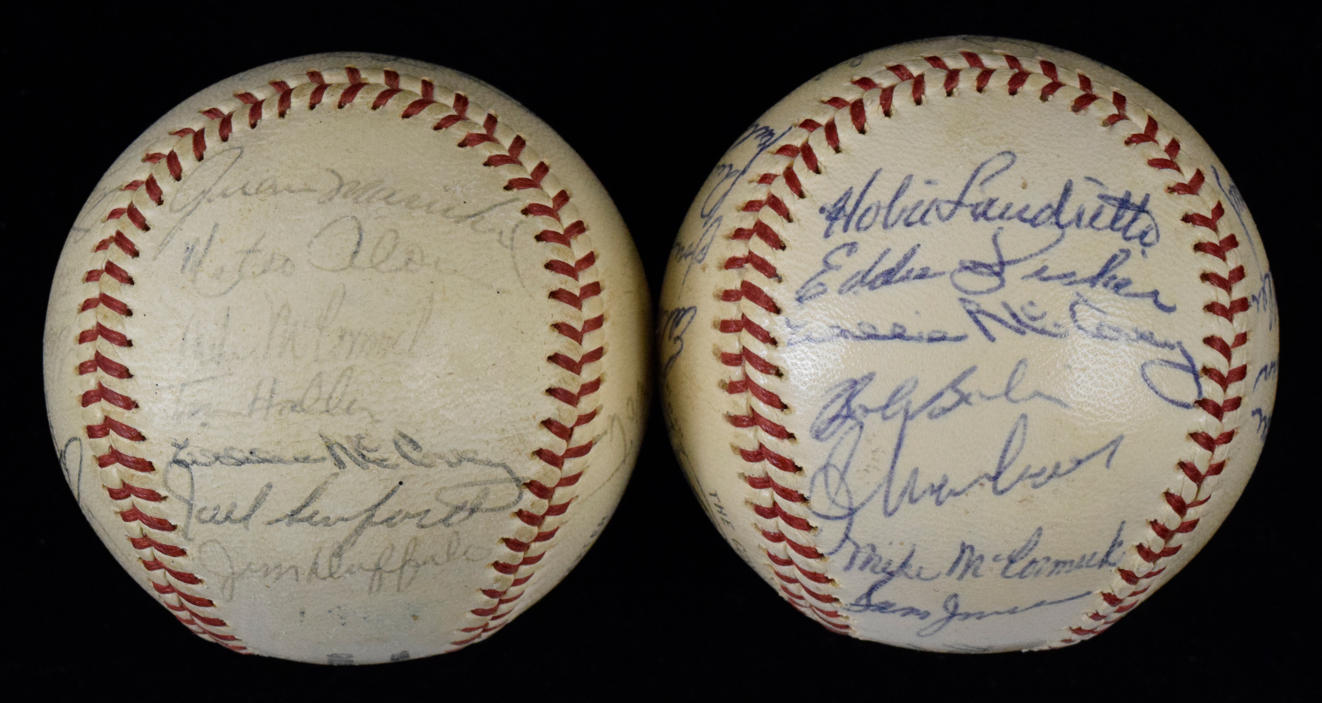 Description:1961 and 1962 San Francisco Giants team signed baseballs (EX-EX/MT). Includes W.Giles NL ball signed by (23) members of the 1961 Giants: Willie McCovey, Orlando Cepeda, Juan Marichal, Mike McCormick, Stu Miller, Felipe Alou, Jim Davenport, Ed Bailey, Jack Sanford, Mateo Alou, Dick LeMay, Jose Pagan, Harvey Kuenn, Joe Amalfitano, and others (Dark is stamped and Mays is clubhouse signed, signatures average 8 out of 10); and W.Giles NL ball signed by (23) members of the 1962 National League champion Giants: Willie McCovey, Orlando Cepeda, Gaylord Perry, Juan Marichal, Felipe Alou, Jim Davenport, Tom Haller, Jack Sanford, Bill O'Dell, Chuck Hiller, Billy Pierce, Harvey Kuenn, Don Larsen, and others (Dark is stamped and Mays is clubhouse signed, signatures average 6/7 out of 10): EX-EX/MT