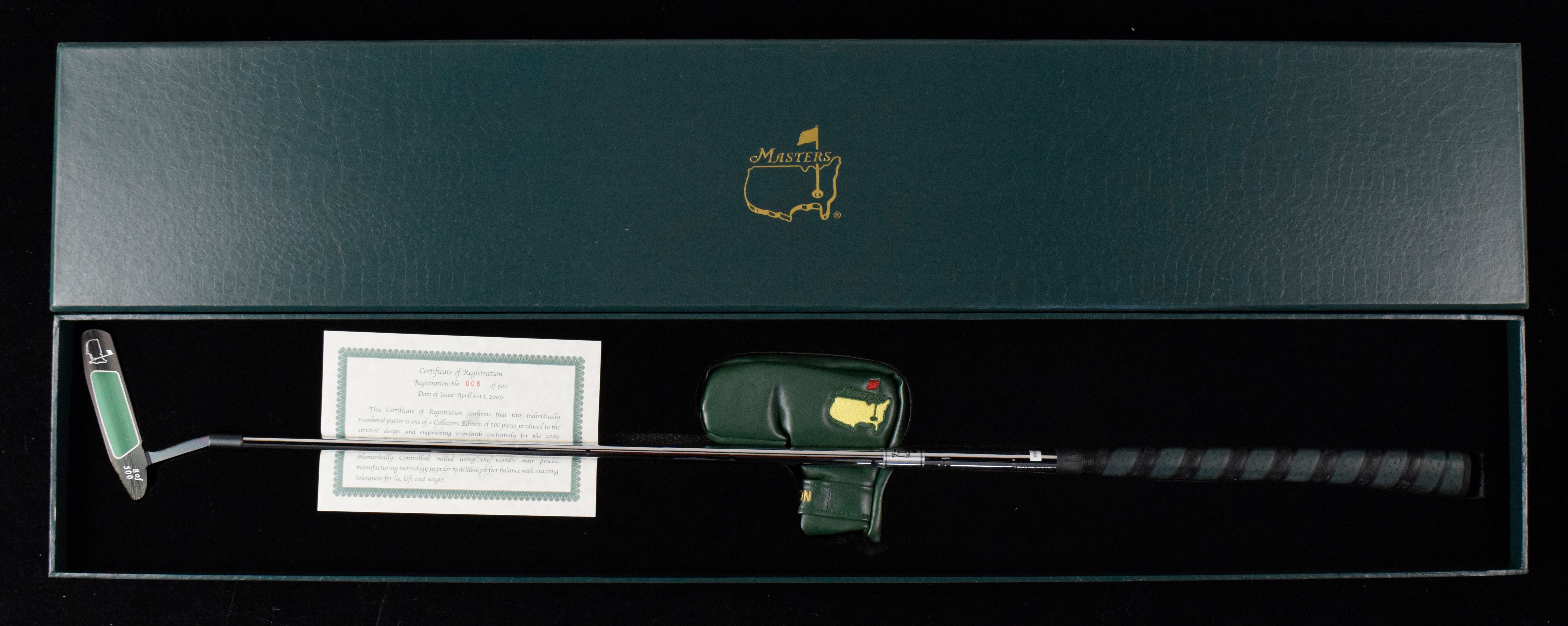 Description:Limited edition Masters putter (NM/MT). Collectors edition produced exclusively for the 2009 Masters Tournament. Numbered 8/500. Includes certificate of registration, and leather head cover: NM/MT