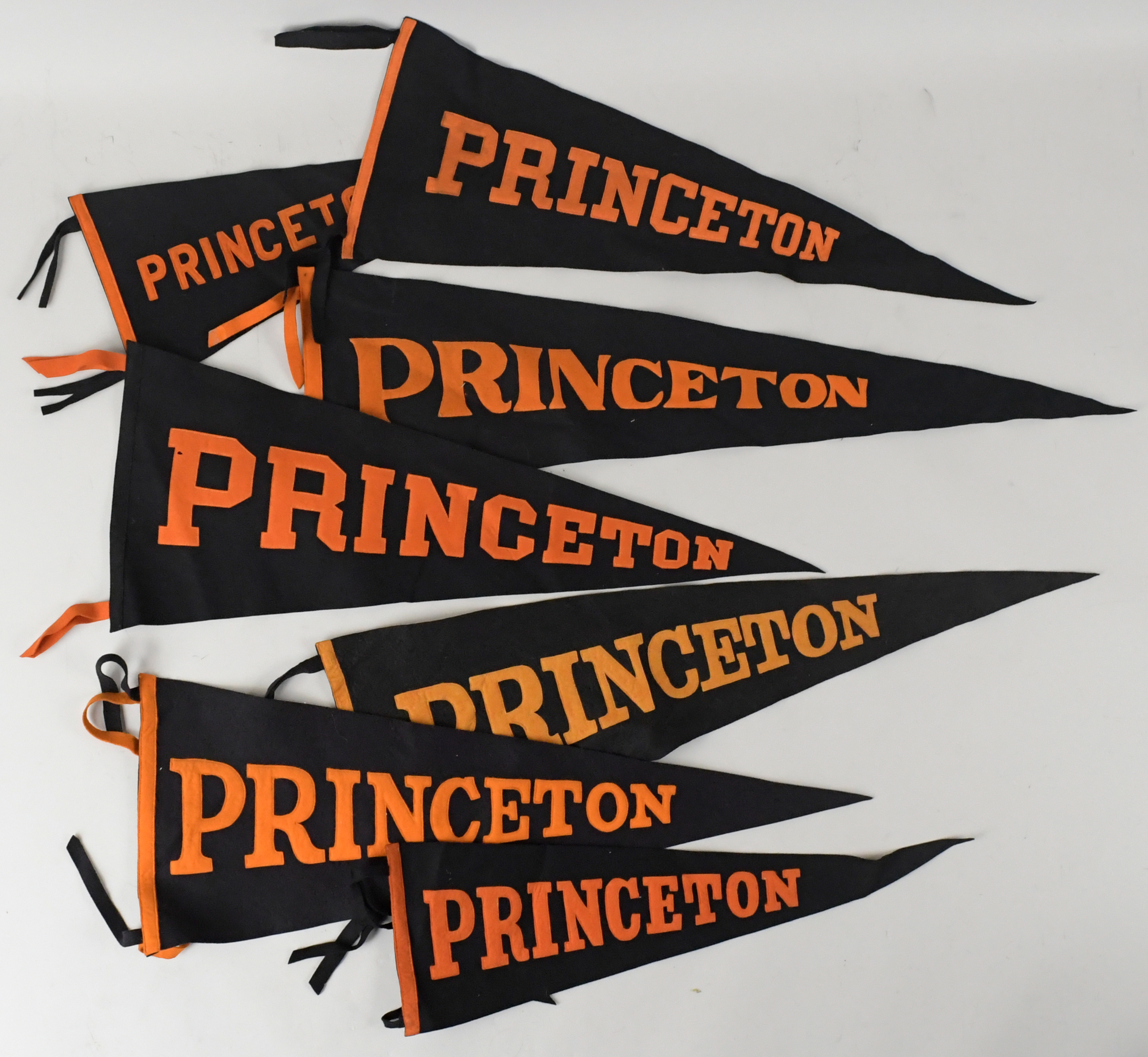 Description:Lot of (11) vintage Princeton banners and pennants (VG-NM). Includes 36"x66" 1944 Princeton banner, 36"x63.5" 1945 Princeton banner, 35"x69" 1947 Princeton banner (VG), 34.5"x69.5" 1961 Princeton banner, 28" Chicago Pennant Co. Princeton pennant, 28.5" Collegiate Manufacturing Co. Princeton pennant, 34" Princeton pennant, 31" Princeton pennant, 29" Princeton pennant, 23.5" Princeton pennant, and 20.5" Princeton pennant. Most appear to average EX-EX/MT overall. Range: VG-NM ($400-$600)