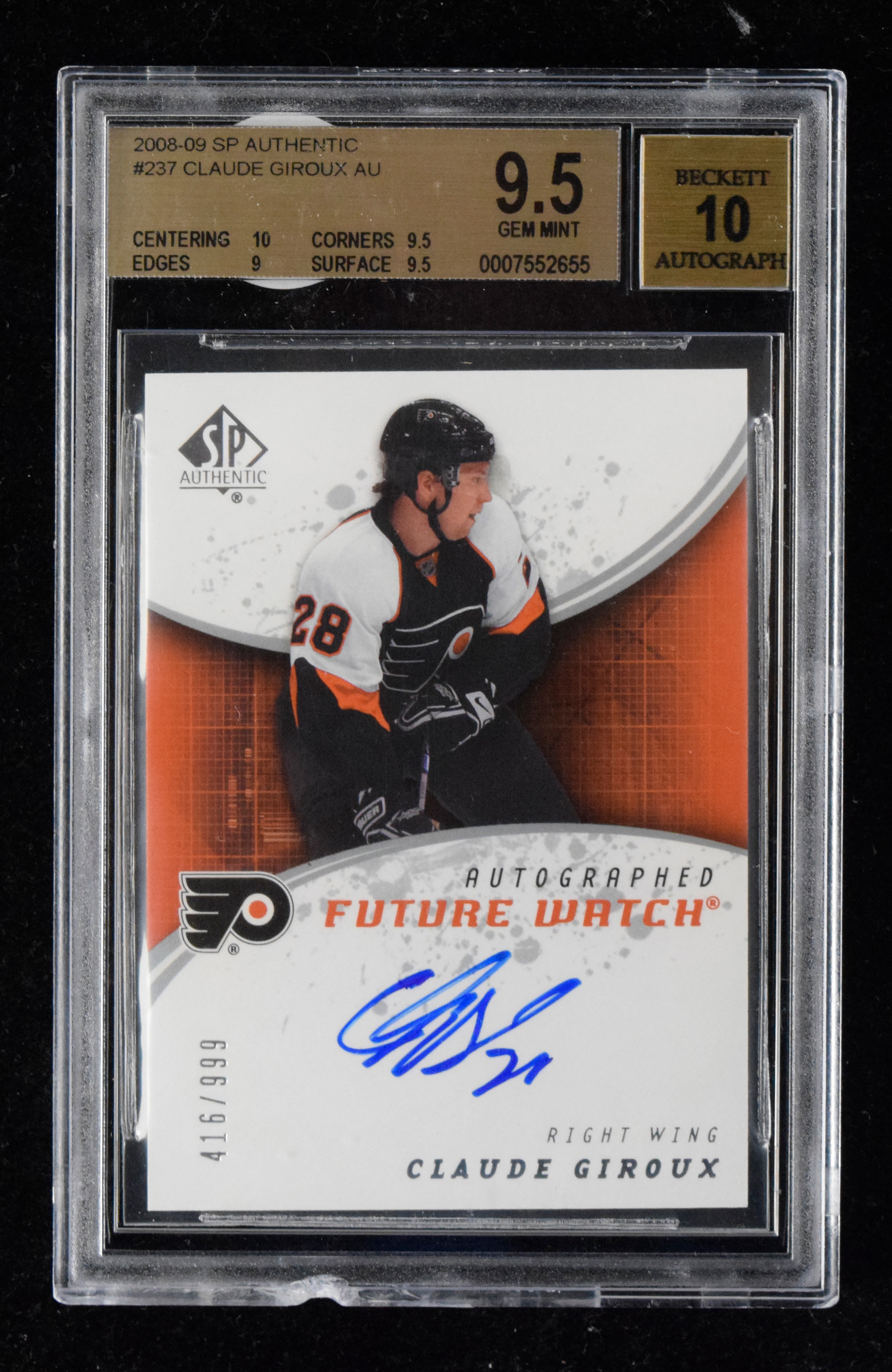 Description:2008-09 SP Authentic #237 Claude Giroux signed rookie card #ed 416/999 graded Beckett 9.5 (Gem MT, auto graded 10).
