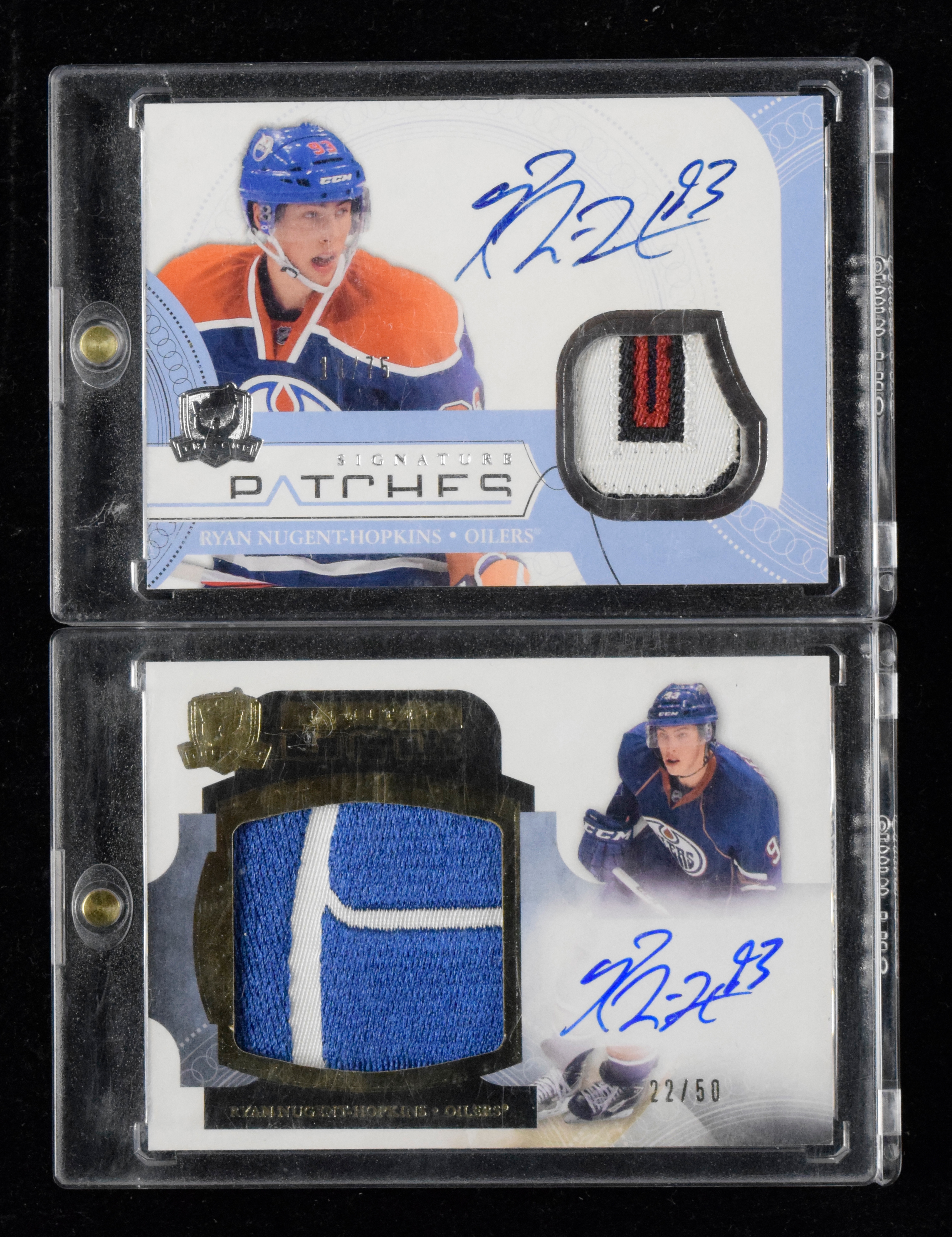 Description:Lot of (2) Ryan Nugent-Hopkins signed serial #ed rookie patch autograph insert cards (NM-NM/MT). Includes 2011-12 Upper Deck The Cup "Limited Logos Autographs" #LL-NH signed by Nugent-Hopkins (#ed 22/50), and 2011-12 Upper Deck The Cup "Signature Patches" #SP-RNH signed by Nugent-Hopkins (#ed 13/75). Signatures rate 9 to 10 out of 10: NM-NM/MT