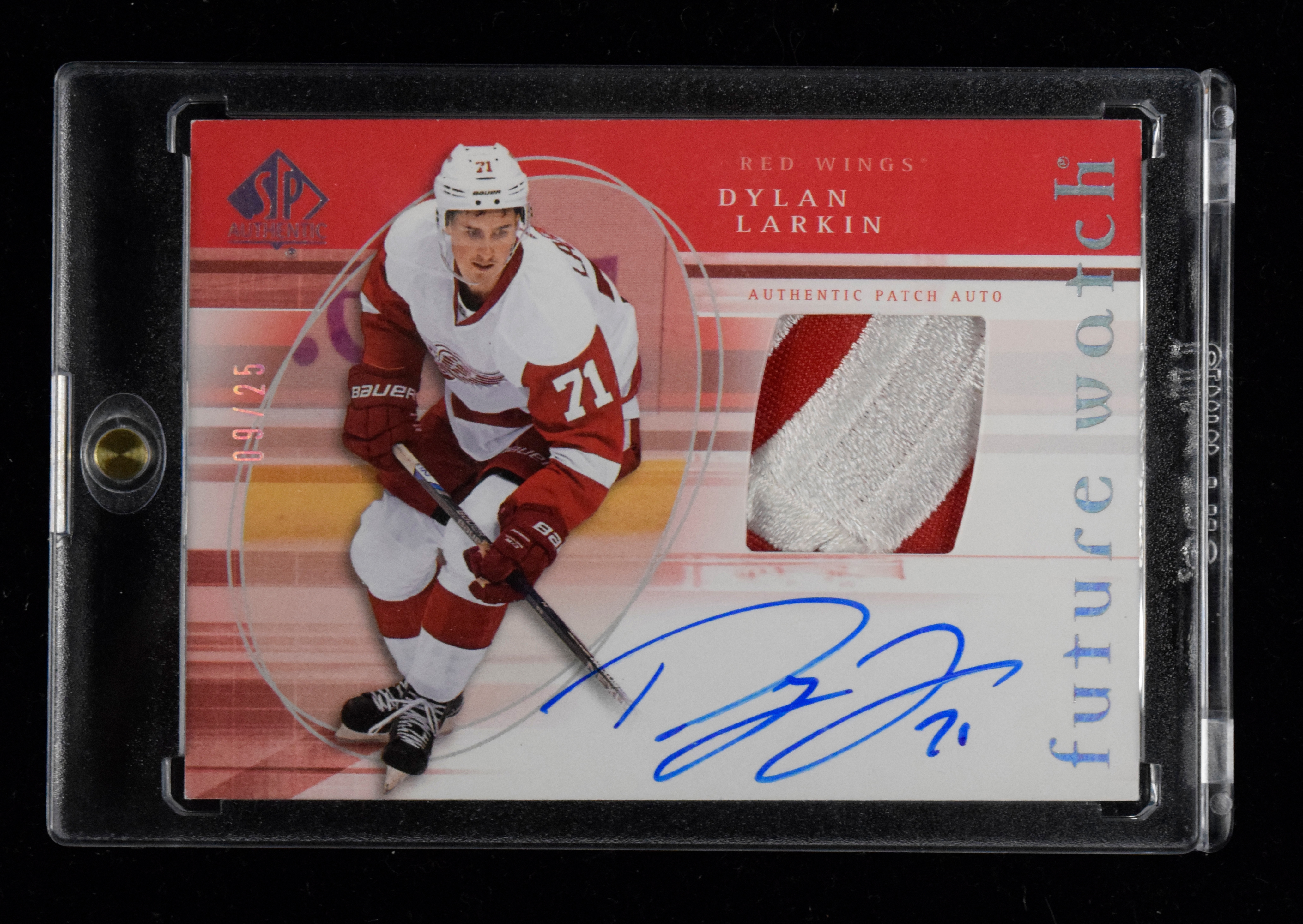 Description:Dylan Larkin signed 2015-16 SP Authentic rookie patch autograph insert card numbered 9/25 (NM). 2015-16 SP Authentic "SP Retro Future Watch Patch Autographs" #R62 signed by Larkin in blue marker. Signature rates 9 out of 10. The card is #ed 9/25: NM