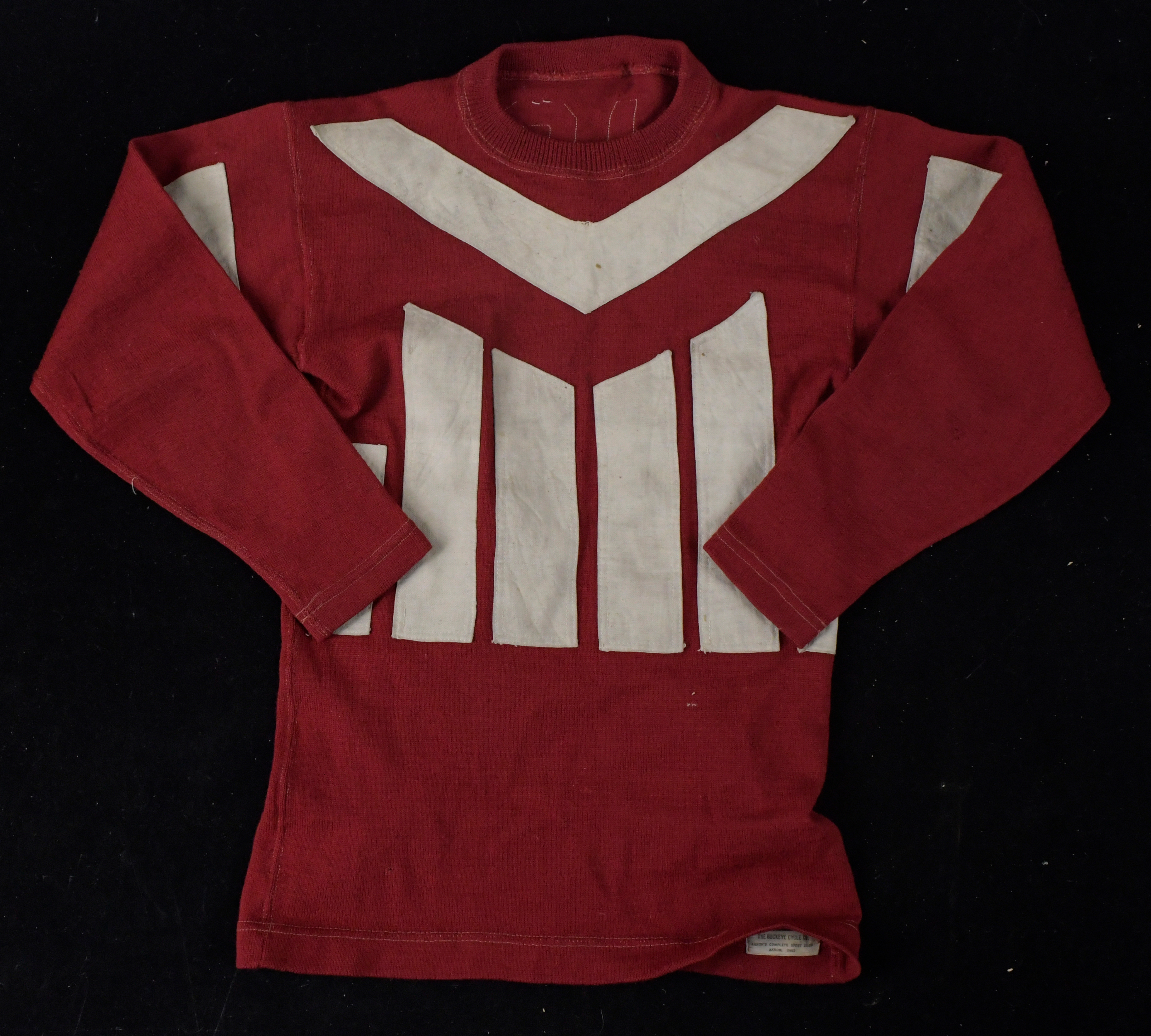 Description:Buckeye Cycle Co. friction strip style football jersey, c.1920s-30s (EX). The Buckeye Cycle Co. jersey with #18 "SPICER BILLIARDS" sewn on the back, and white canvas strips sewn on the chest and sleeves. Visible wear, with areas of stretched fabric, but not extreme: EX/MT ($500-$750)
