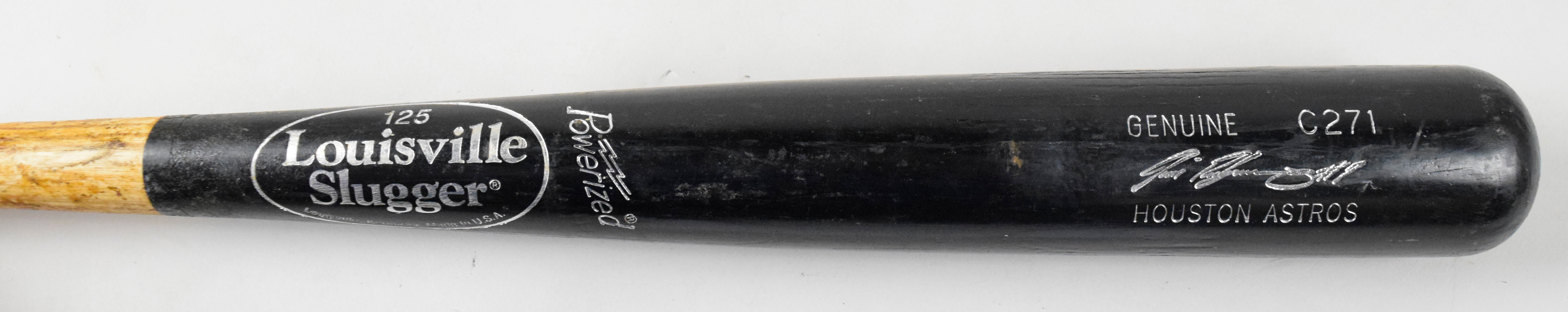 Description:2009 Ivan Rodriguez game used baseball bat (EX fantastic use). 34" Louisville Slugger C271 Ivan Rodriguez model bat with "7/21/2009" production date stamped on the knob and Houston Astros team on the barrel. #77 is written on the knob and on the end of the bat. Exceptional use with ball marks, heavy grain swelling, spike marks, pine tar caked on the handle, and a strip of tape around the knob. Includes certificate of provenance from Rodriguez: EX