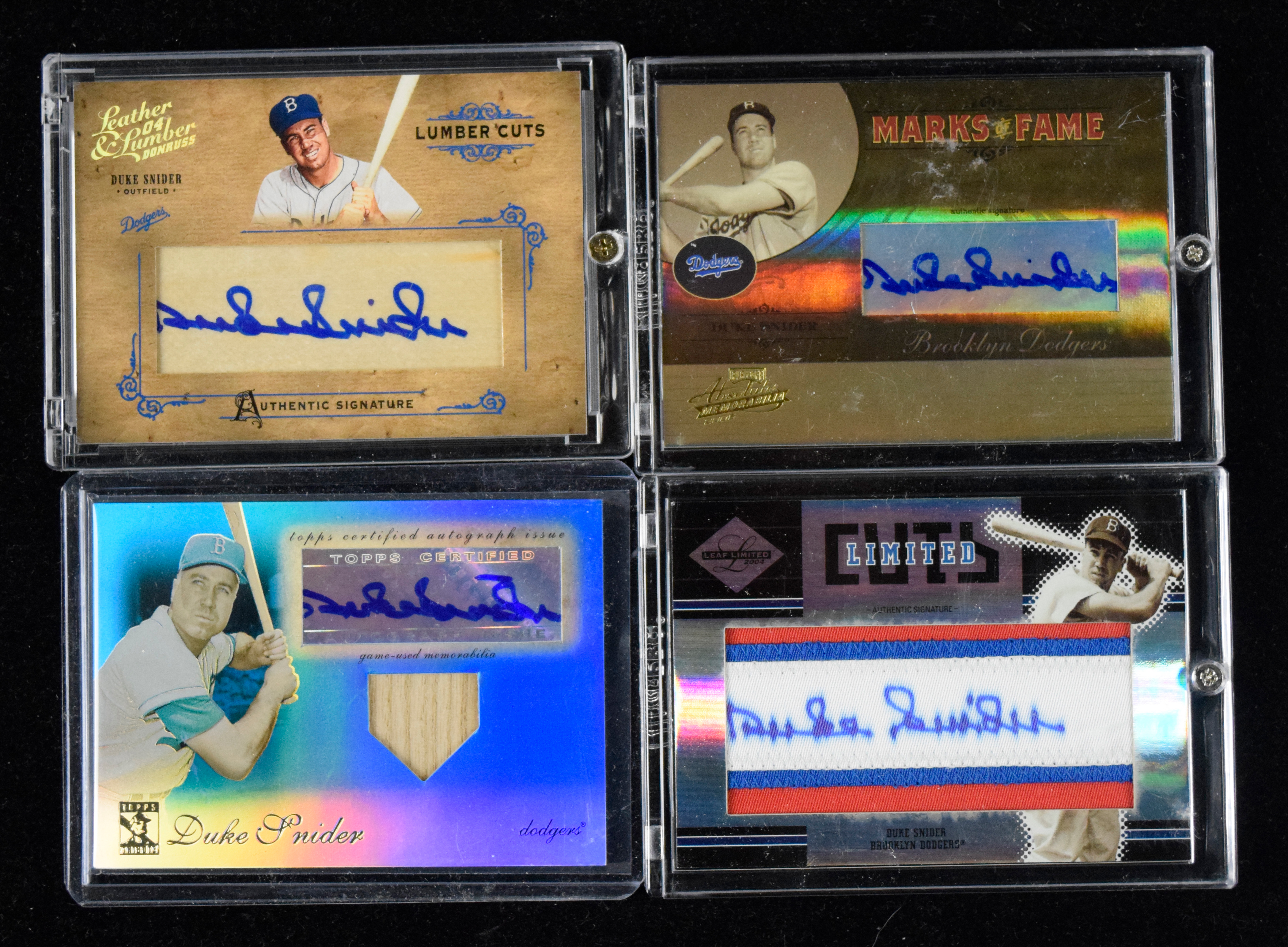Description:Lot of (4) Duke Snider signed serial numbered insert cards (NM-NM/MT). Includes 2004 Donruss Leather & Lumber "Lumber Cuts Bat Autographs" #LC-14 signed by Snider (#ed 59/96), 2004 Leaf Limited "Limited Cuts" #LC-4 signed by Snider (#ed 81/100), 2005 Playoff Absolute Memorabilia "Marks of Fame Autograph Spectrum" #MF-56 signed by Snider (#ed 17/50), and 2009 Topps Tribute "Autograph Relics Blue" #TAR-DS4 signed by Snider (#ed 22/75). Signatures rate 7/8 (Leaf Limited) to 9/10 out of 10: NM-NM/MT