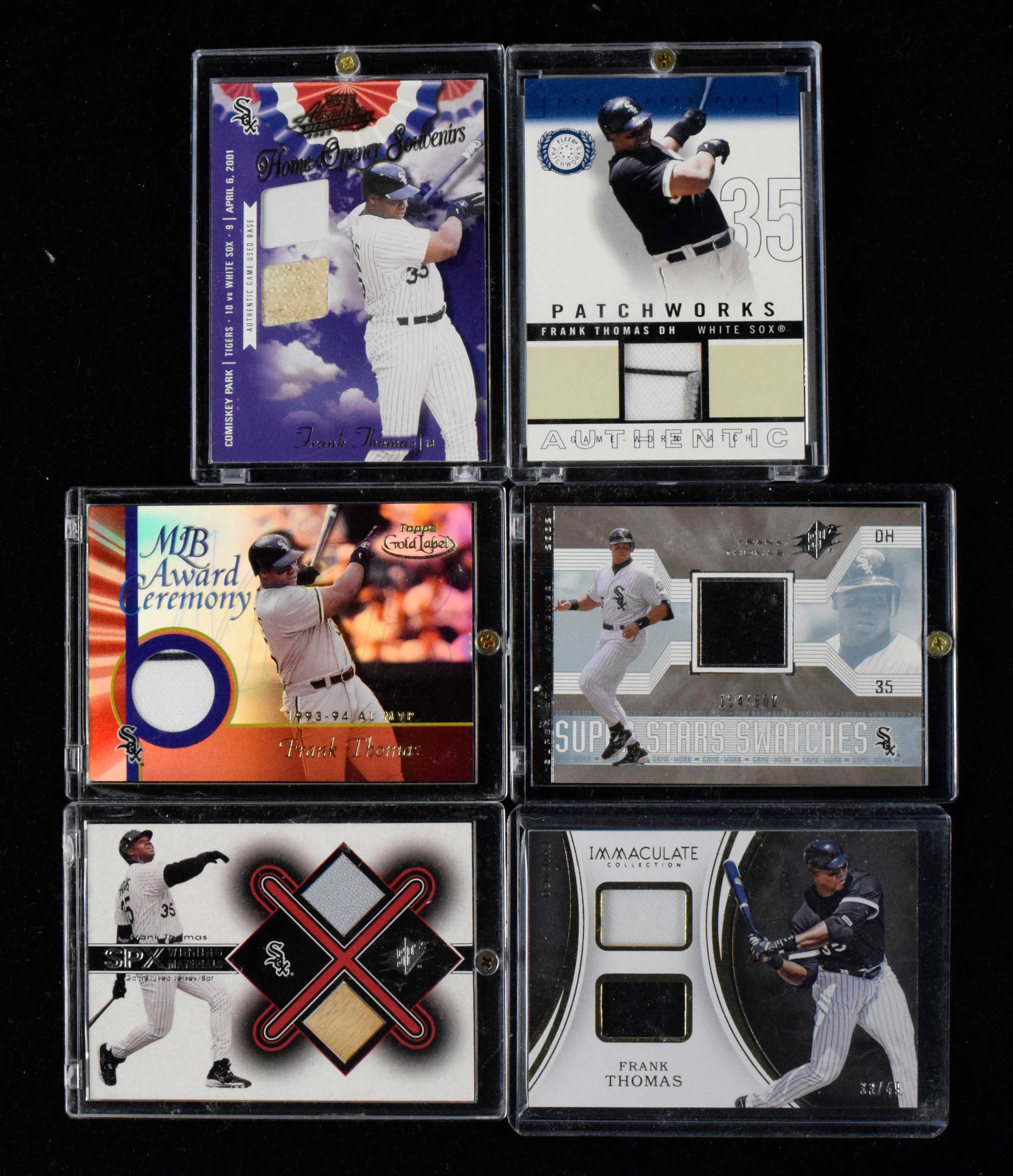Description:Lot of (21) Frank Thomas relic swatch insert cards (NM-NM/MT overall). Includes a dual-relics card with Jeff Bagwell. Others are individual Frank Thomas relic cards with (4) serial numbered: 33/49, 157/200, 185/300, and 194/800: NM-NM/MT overall