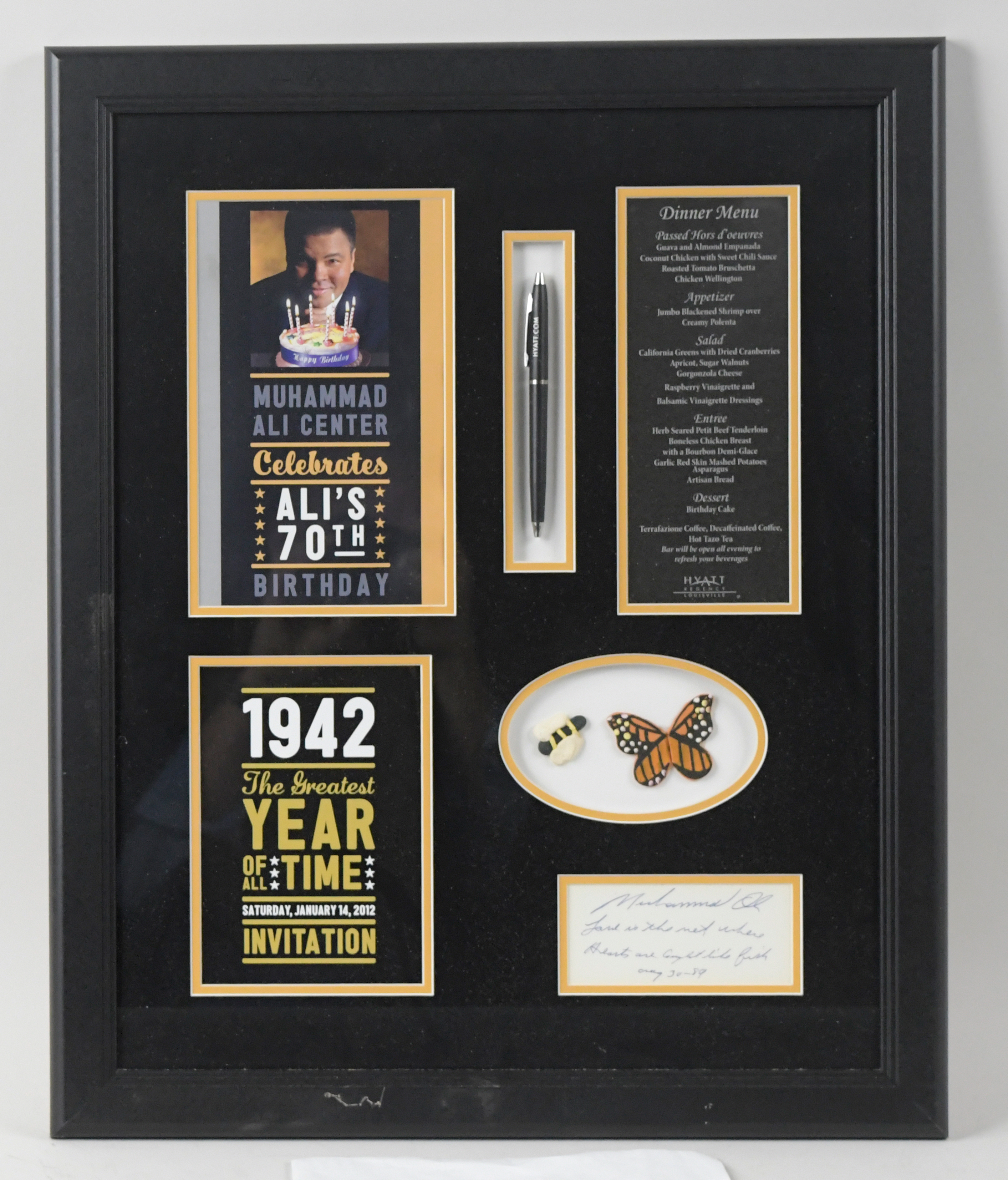 Description:2012 Muhammad Ali signed and inscribed 70th Birthday framed display - PSA/DNA (NM). Approx. 18"x22" framed display containing an Ali matted autograph with "Love is the net where Hearts are caught like fish" inscription and dated "Aug 30 - 89" by Ali, along with other matted items including butterfly and bee decorations from the birthday cake, Ali 70th Birthday photo, invitation to his birthday celebration, dinner menu, and pen from the event. Includes full LOA from PSA/DNA. Due to framing, complete conditions are unknown: NM appearance ($400-$600)