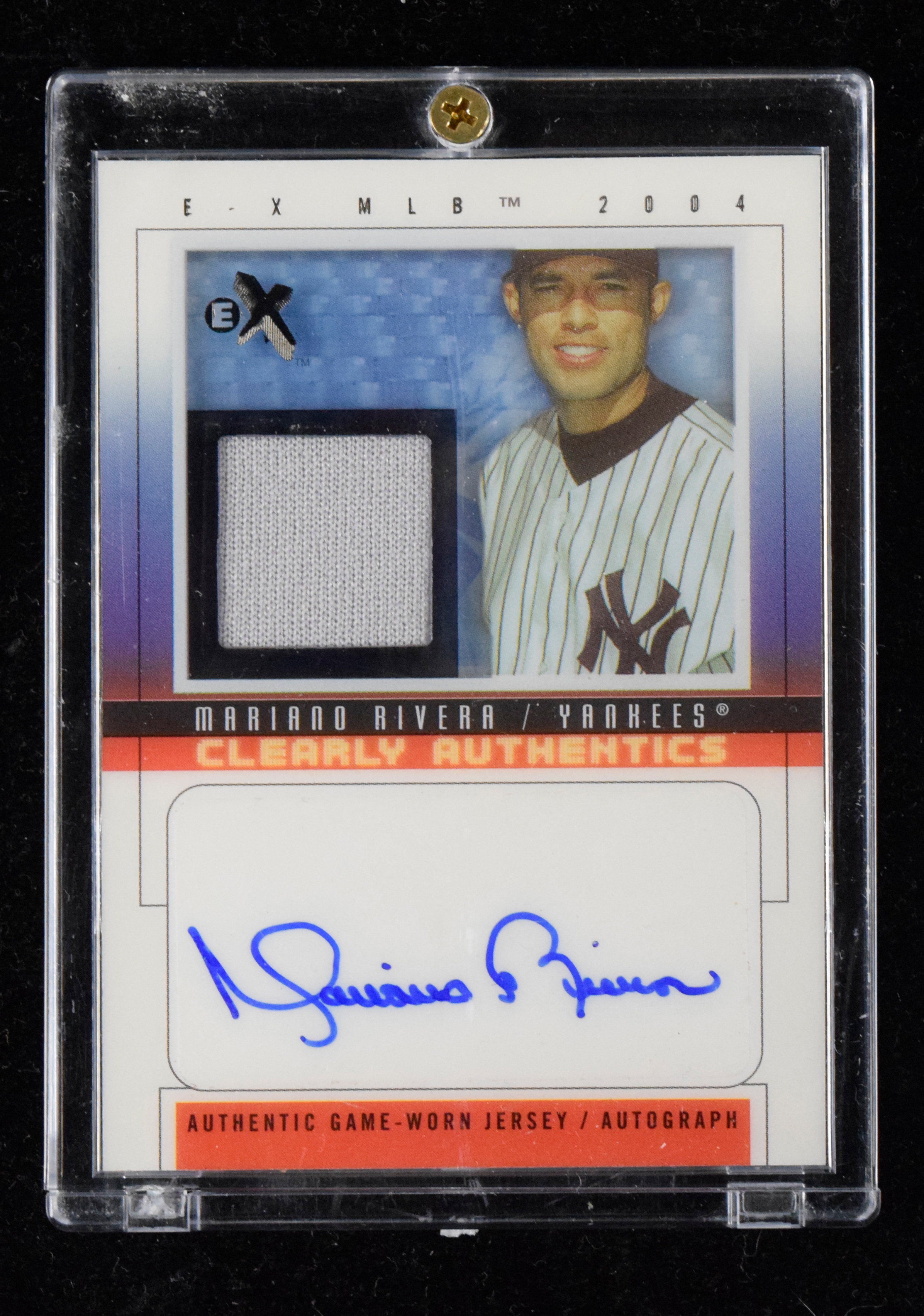 Description:Mariano Rivera signed 2004 Fleer E-X serial numbered relic swatch insert card (NM). 2004 Fleer E-X "Clearly Authentics Signature Jersey Black" #CAS-MR2 signed by Rivera in blue marker. Signature rates 9/10 out of 10. The card is #ed 34/50: NM