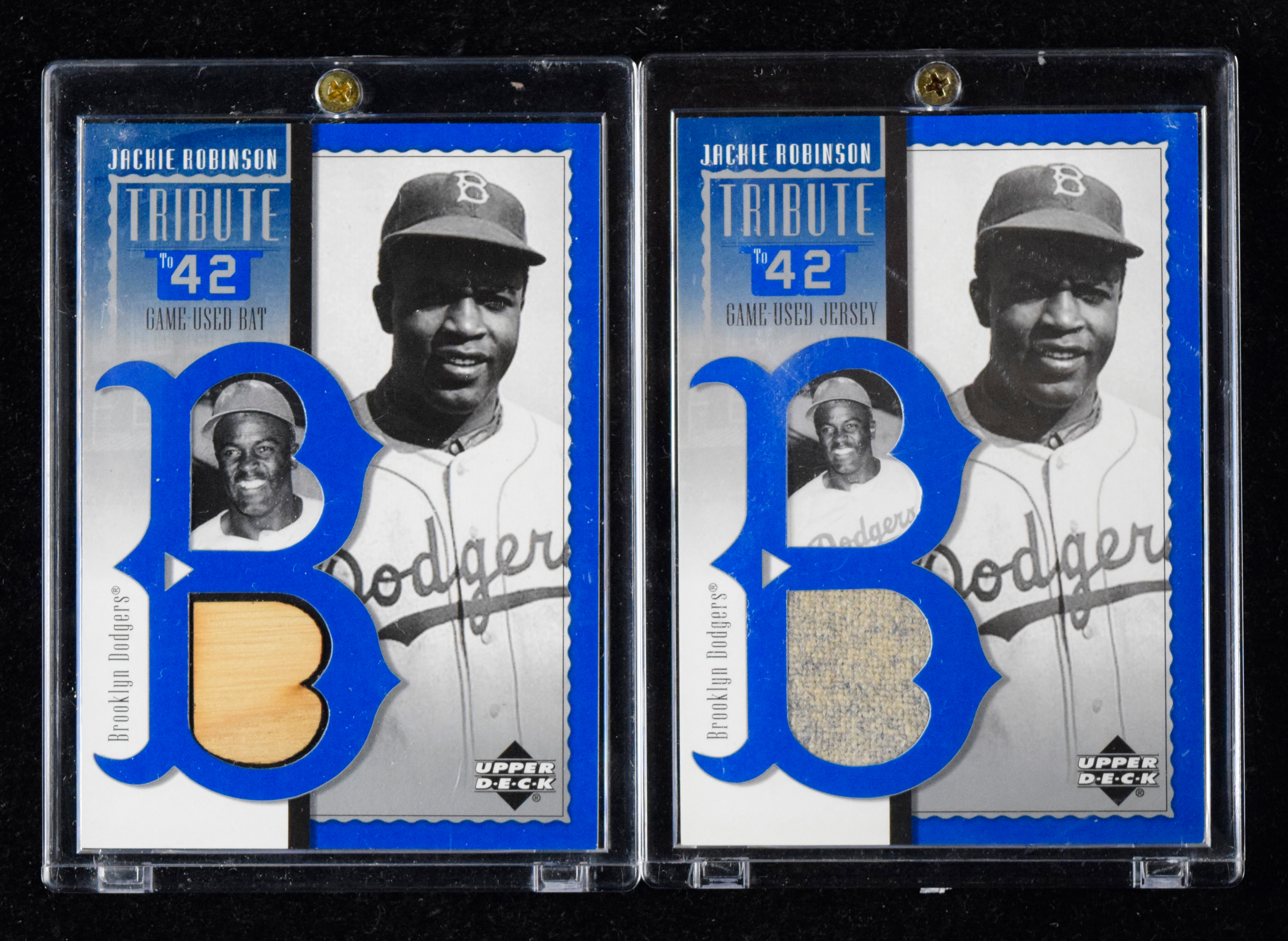 Description:Jackie Robinson 2001 Upper Deck Prospect Premieres game used bat & uniform relic insert cards (NM-NM/MT). Includes 2001 Upper Deck Prospect Premieres "Jackie Robinson Tribute to 42" #s B Robinson bat card, and J Robinson uniform card: NM-NM/MT