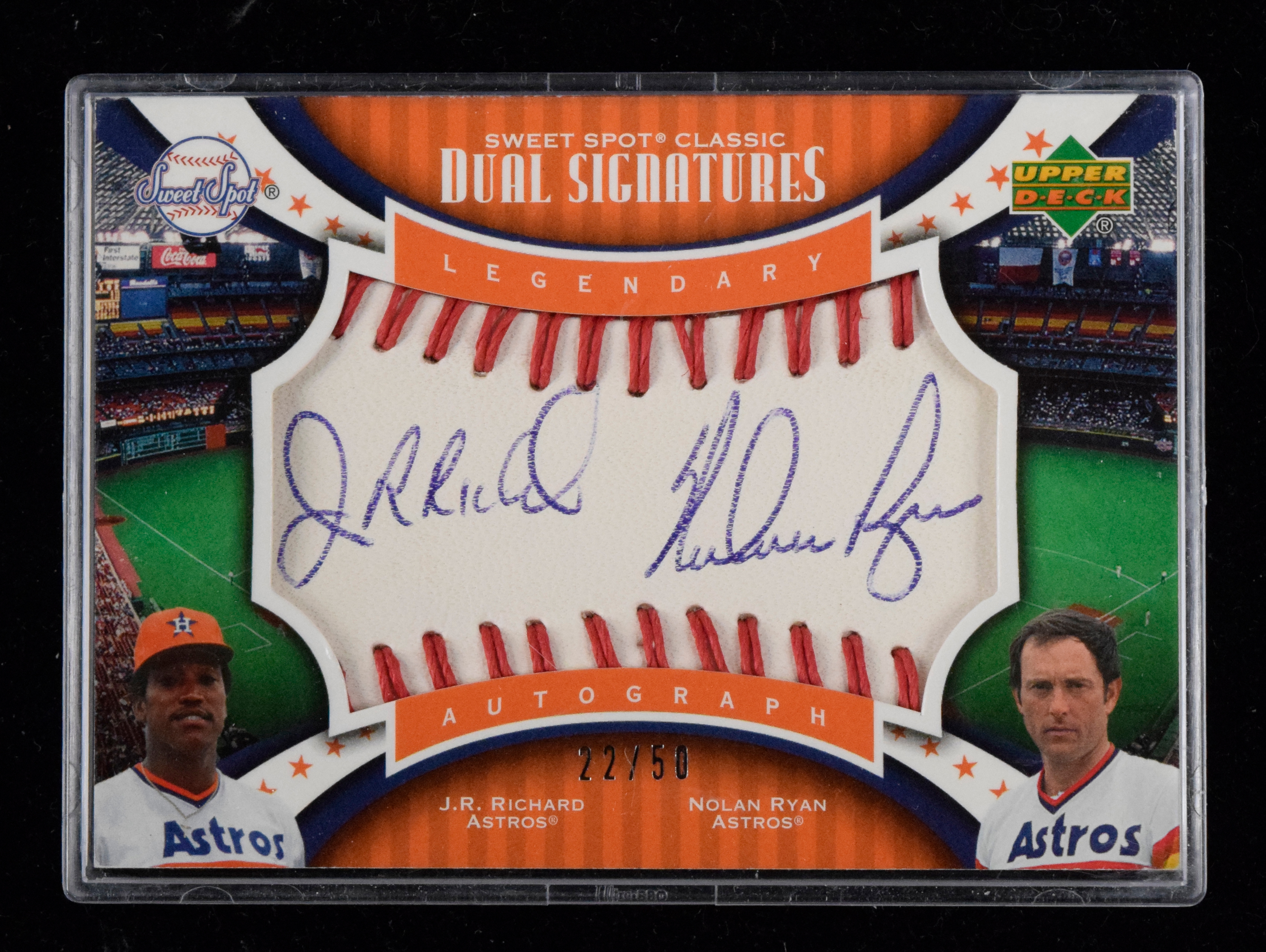 Description:Nolan Ryan & J.R. Richard dual-signed 2007 Upper Deck Sweet Spot Classic serial #ed insert card (NM). 2007 Upper Deck Sweet Spot Classic "Dual Signatures Red Stitch Blue Ink" #SPDS-RR signed by both Ryan and Richard in blue ink. Signatures rate 8 out of 10. The card is numbered 22/50: NM