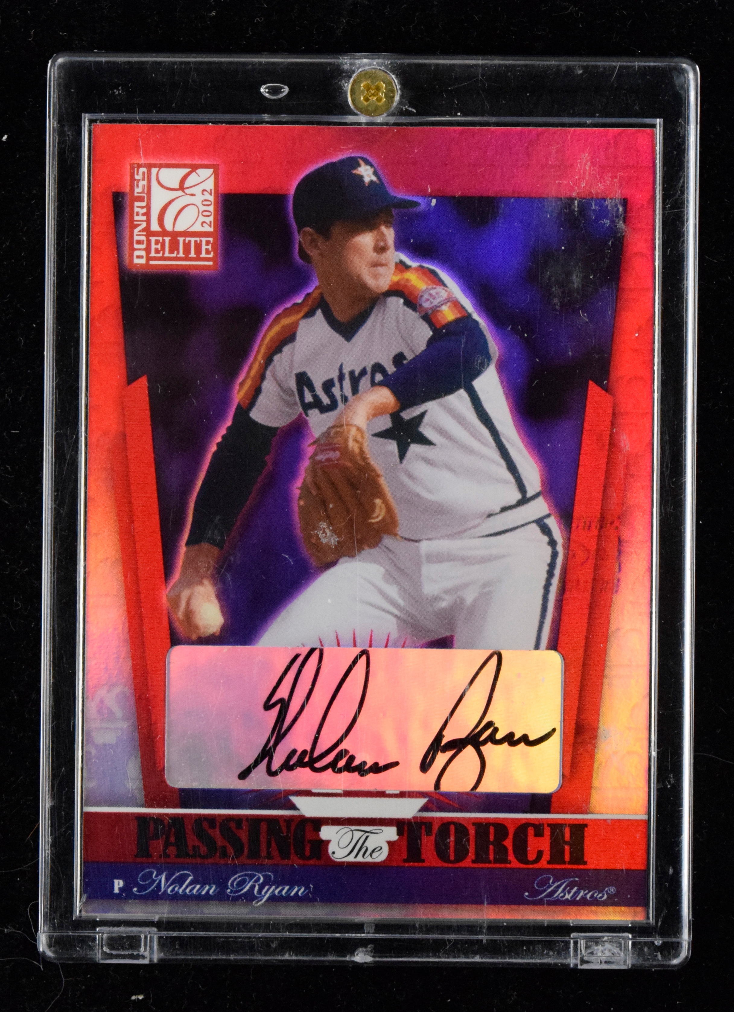 Description:Nolan Ryan signed 2002 Donruss Elite serial numbered insert card (NM). 2002 Donruss Elite "Passing the Torch Autographs" #PT-11 signed by Ryan in black marker. Signature rates 9 out of 10. The card is #ed 99/100: NM