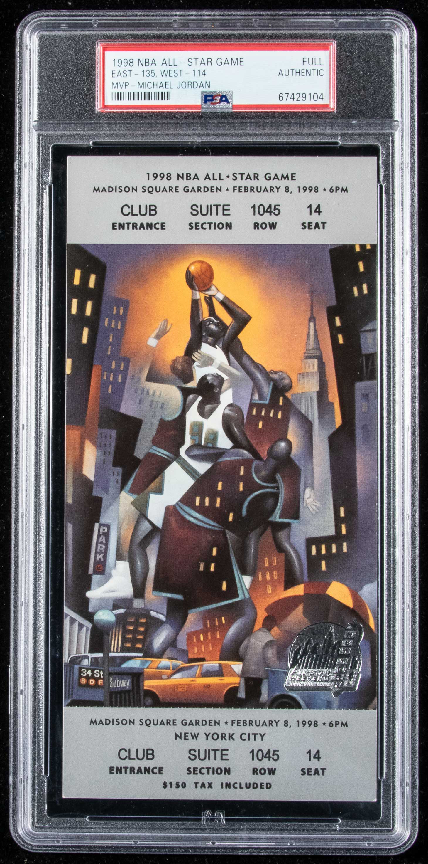 Description:Rare 1998 NBA All-Star Game full ticket - Jordan MVP and Bryant ASG debut (PSA Authentic). 2/8/1998 Madison Square Garden full ticket for game in which the East defeated the West by a score of 135-114 behind Michael Jordan's MVP performance scoring 23-points along with 6-rebounds and 8-assists. Kobe Bryant made his All-Star Game debut scoring 18-points. Authenticated and encapsulated within PSA Authentic holder: EX appearance ($500-$1,000)