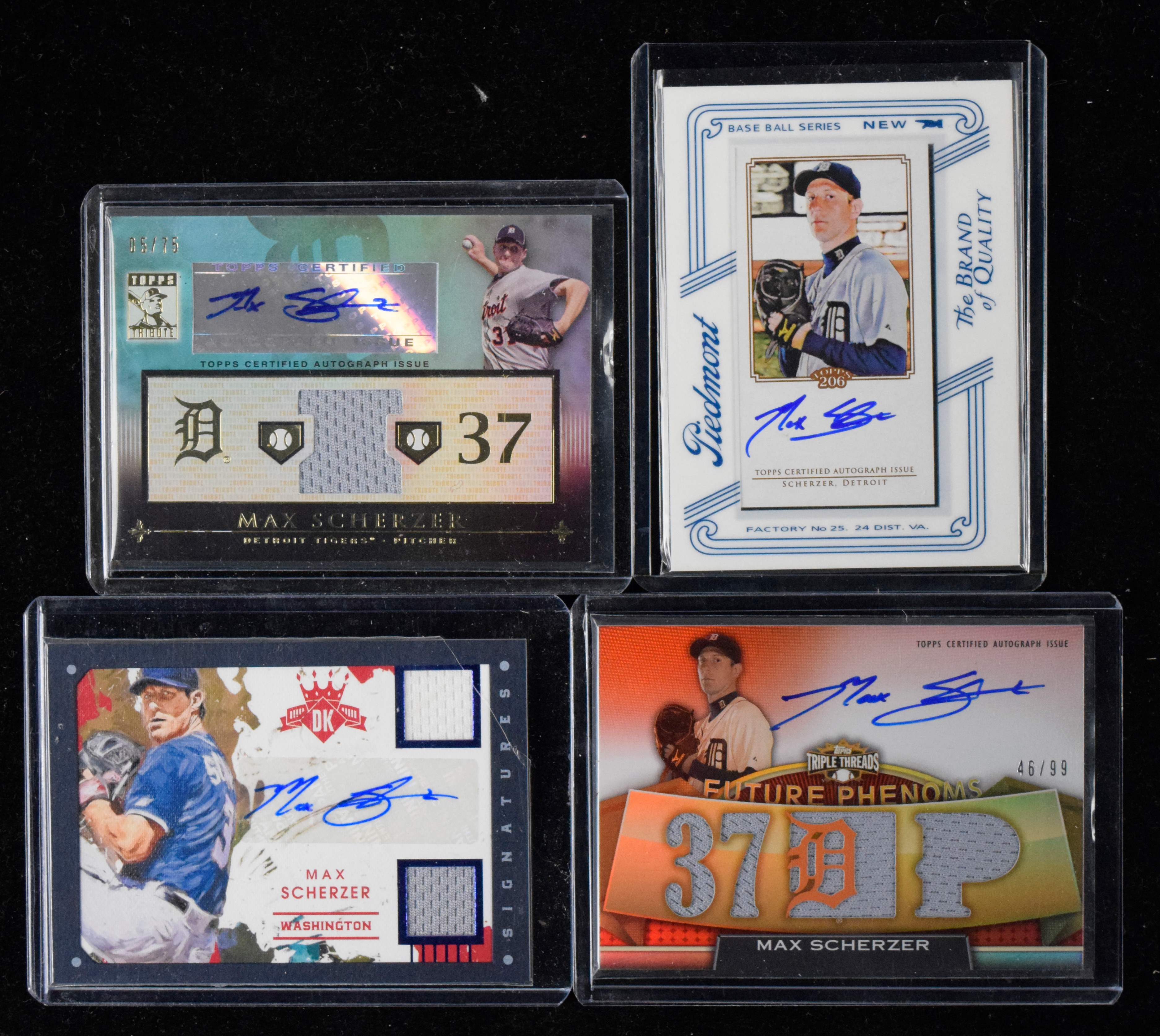 Description:Lot of (4) Max Scherzer signed insert cards including relics & serial numbered (EX/MT-NM/MT). Includes 2010 Topps 206 "Framed Mini Autographs Piedmont" #TA-MS signed by Scherzer, 2010 Topps Tribute "Autograph Relics Blue" #TAR-MS3 signed by Scherzer (#ed 5/75), 2011 Topps Triple Threads #116 jersey card signed by Scherzer (#ed 46/99), and 2016 Panini Diamond Kings "Framed Signatures Blue" #DKS-MX double jersey relics card signed by Scherzer (#ed 6/10, EX/MT light corner wear). Signatures rate 9 to 10 out of 10: EX/MT-NM/MT
