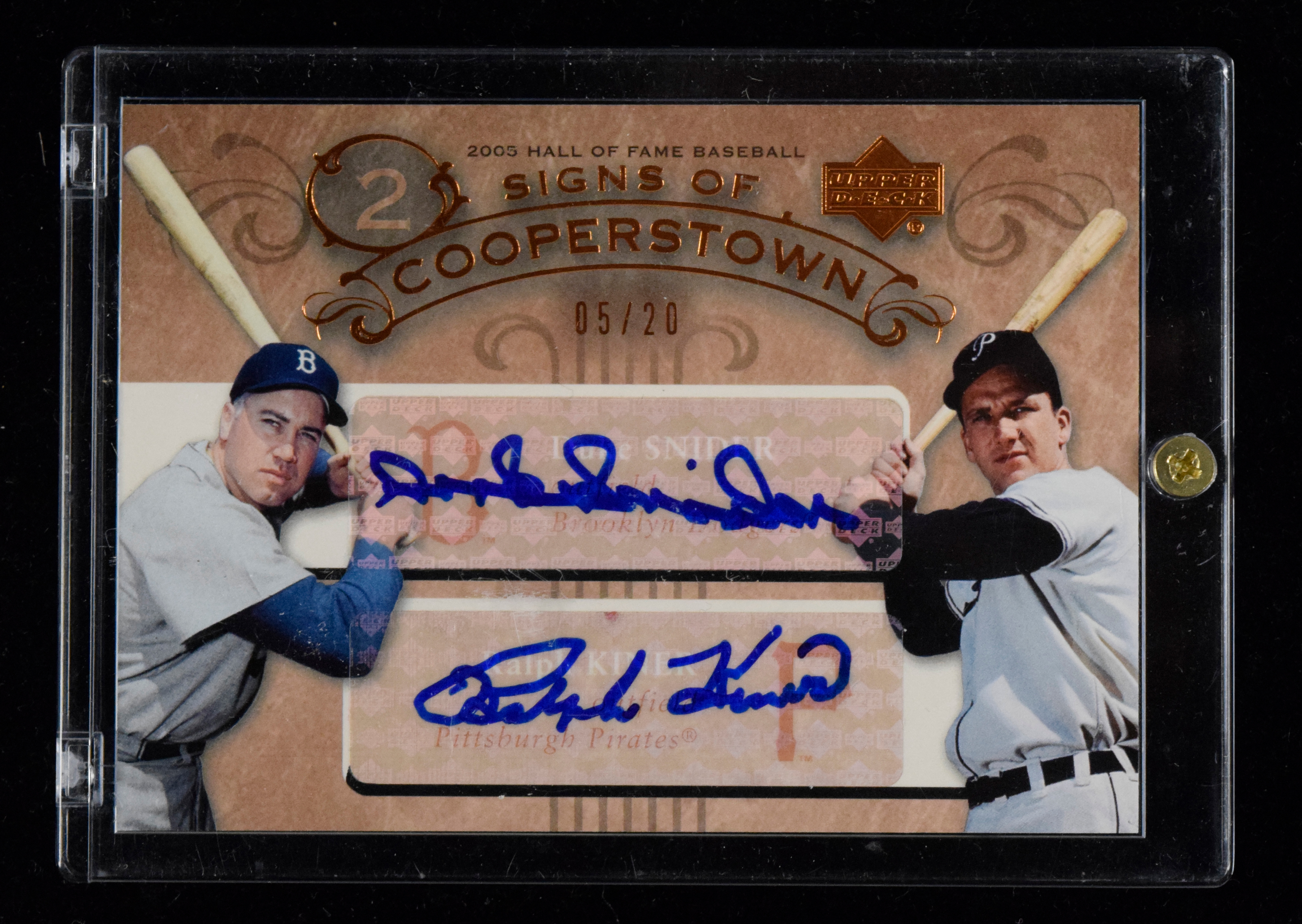Description:Ralph Kiner & Duke Snider dual-signed 2005 Upper Deck Hall Of Fame insert card #ed 5/20 (NM). 2005 Upper Deck Hall Of Fame "Signs of Cooperstown Duals Autograph" #SK signed by both Kiner and Snider in blue marker. Signatures rate 9 to 10 out of 10: NM