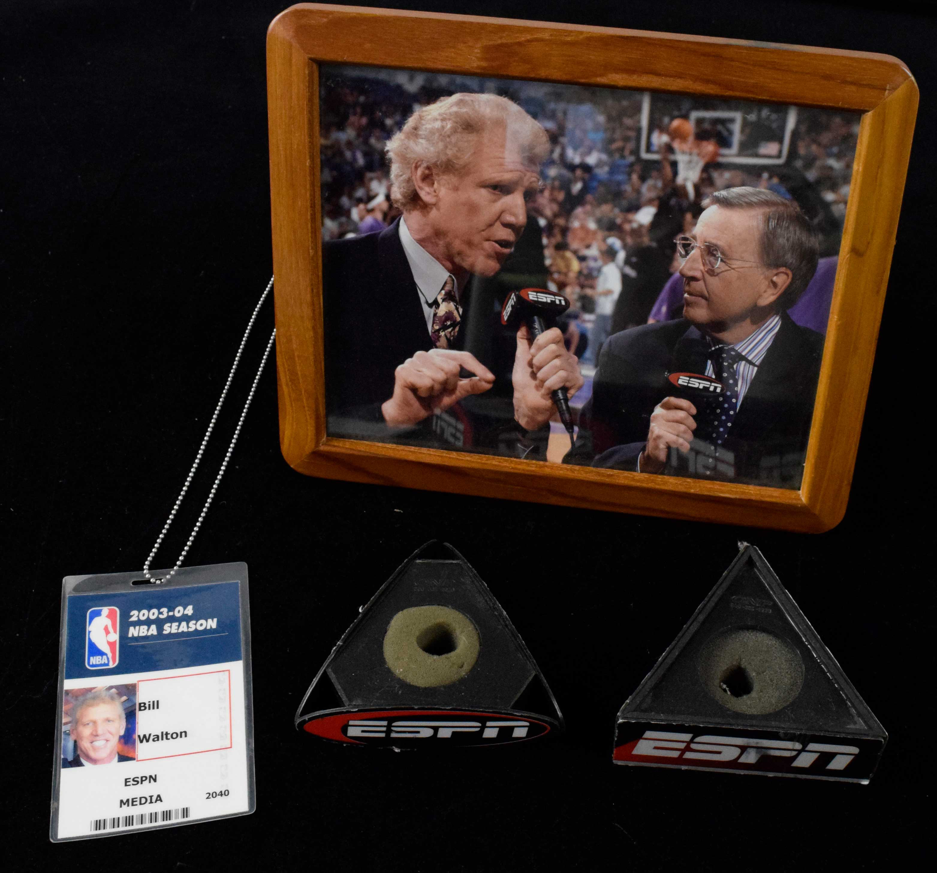 Description:Bill Walton's 2003-04 NBA ESPN media credential with related pieces (EX-NM). Includes Walton's credential issued by the NBA for the 2003-04 season with his name, image, and ESPN affiliation printed on; (2) ESPN logo microphone covers; and 9.5"x11.5" framed photo picturing Walton with Brent Musburger while working for ESPN. Includes certificate of provenance from the Walton Family: EX-NM