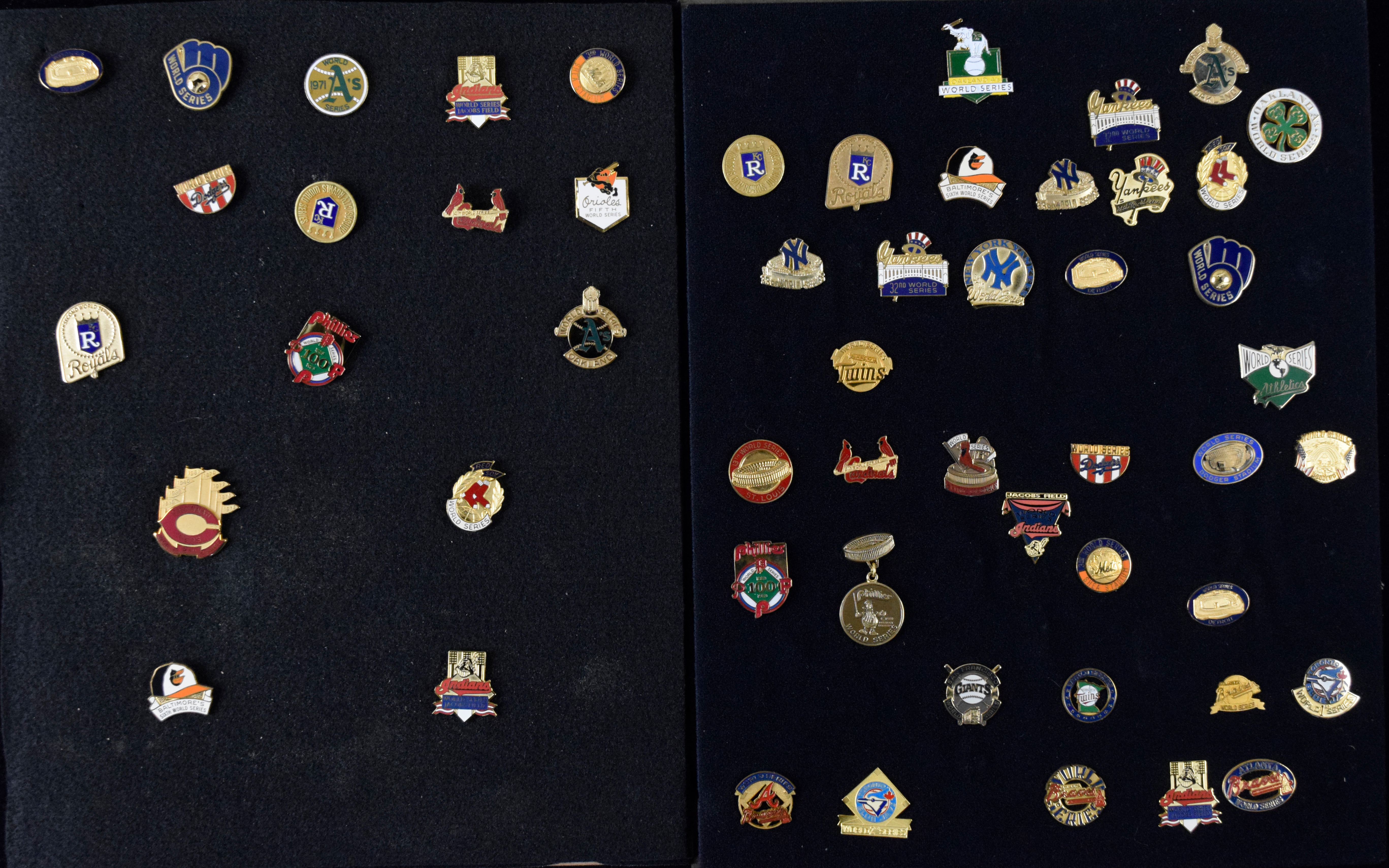 Description:Collection of (53) World Series press pins from 1971-1998 (EX-NM/MT). Includes 1971 Oakland A's phantom, 1974 Los Angeles Dodgers, 1975 Oakland A's phantom, (2) 1978 New York Yankees, 1979 Baltimore Orioles, 1980 Philadelphia Phillies, (2) 1980 Kansas City Royals, 1981 Dodgers, (2) 1981 Yankees, 1982 St. Louis Cardinals, (2) 1982 Milwaukee Brewers, (2) 1983 Phillies, (2) 1983 Orioles, (3) 1984 Detroit Tigers, (2) 1985 Royals, (2) 1985 Cardinals, (2) 1986 New York Mets, (2) 1986 Boston Red Sox, 1987 Minnesota Twins, 1987 Cardinals, (2) 1988 Dodgers, (2) 1988 Oakland A's, 1989 Oakland A's, 1989 San Francisco Giants, 1990 Cincinnati Reds, 1990 Oakland A's, 1991 Twins, 1991 Atlanta Braves, 1992 Toronto Blue Jays, 1992 Braves, 1993 Blue Jays, 1995 Braves, (3) 1995 Cleveland Indians, 1996 Braves, 1996 Yankees, 1997 Indians, and 1998 Yankees. Most appear to average NM overall, but do NOT have clasps, and are pinned on boards for display: EX-NM/MT ($750-$1,000)