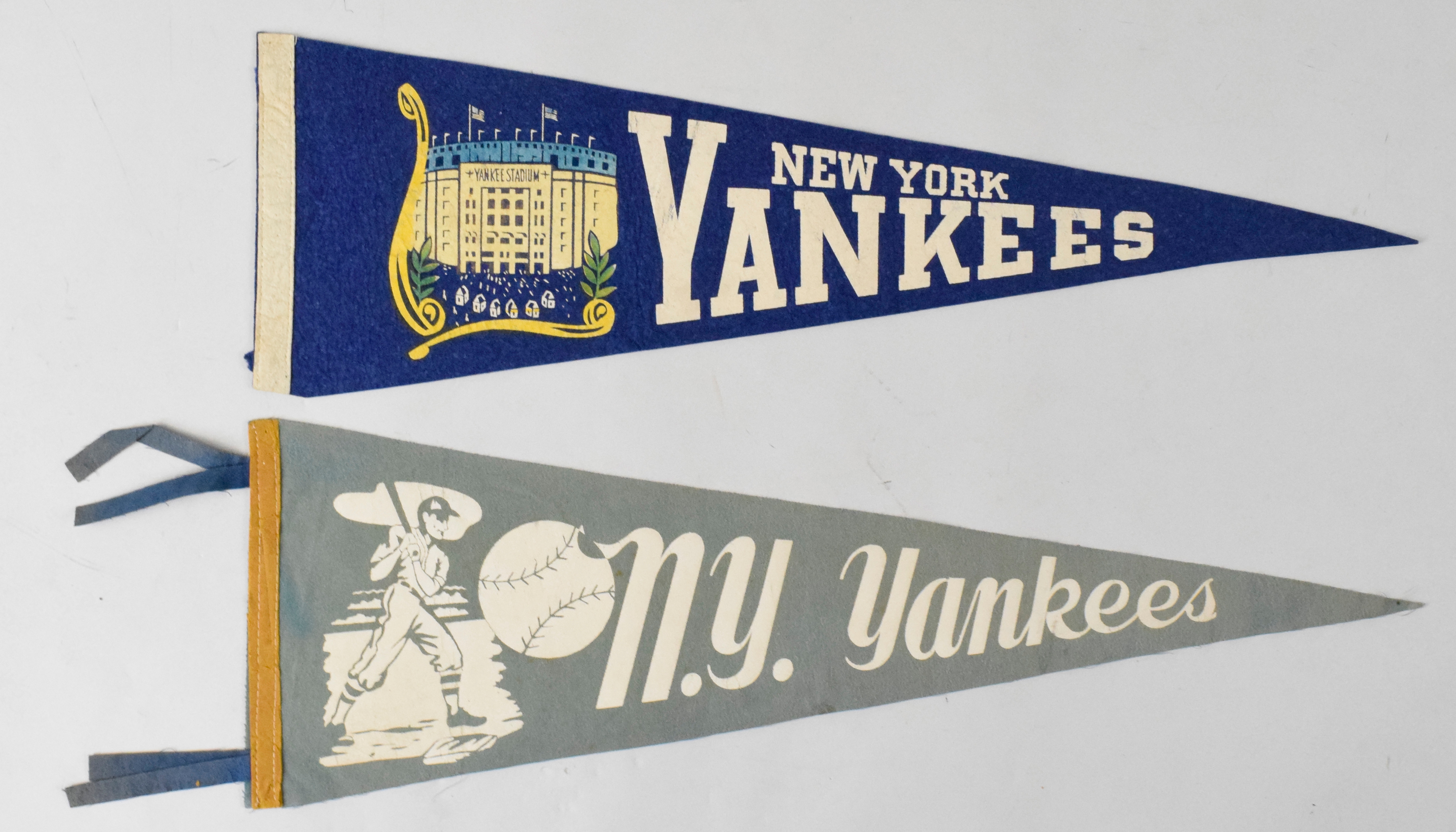 Description:Lot of (2) vintage New York Yankees pennants, c.1940s Includes 26" Yankee Stadium pennant (VG/EX-EX clipped tassels), and 26" Yankees pennant with batter graphic (VG-VG/EX).