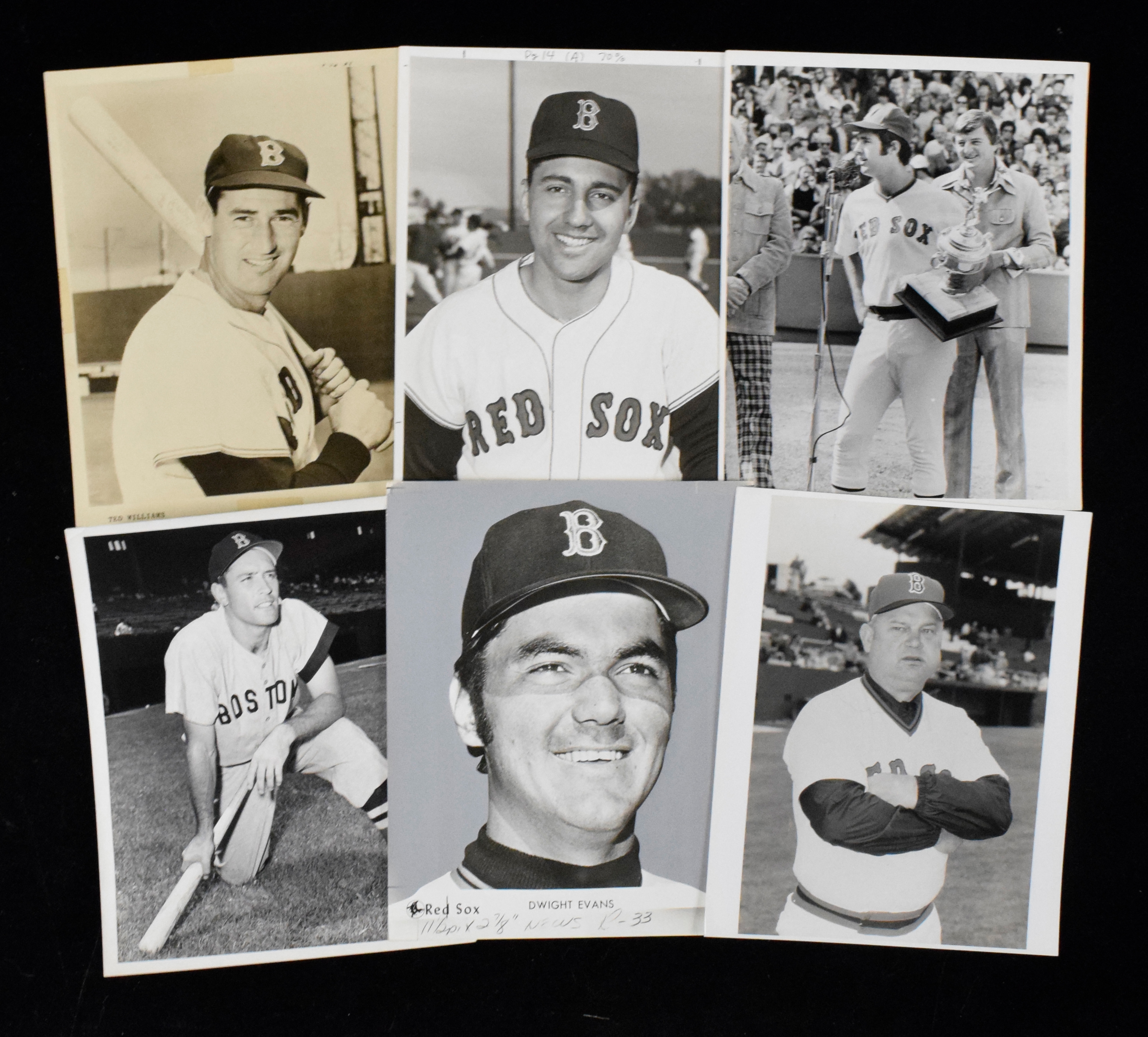 Description:Lot of (47) vintage Boston Red Sox photographs, c.1950s-70s (PR/FR-NM). Most are around 8"x10". Includes Ted Williams, (5) Fred Lynn, Jimmy Piersall, (2) Dwight Evans, Lou Clinton, Don Buddin, Don Zimmer, Butch Hobson, Bob Stanley, Jerry Remy, George Scott, Bill Lee, Rico Petrocelli, Juan Beniquez, Gene Stephens, Roger Moret, Ben Oglivie, Duane Josephson, Ken Tatum, and others. Various conditions throughout the lot. Most appear to average VG/EX-EX overall. Range: PR/FR-NM