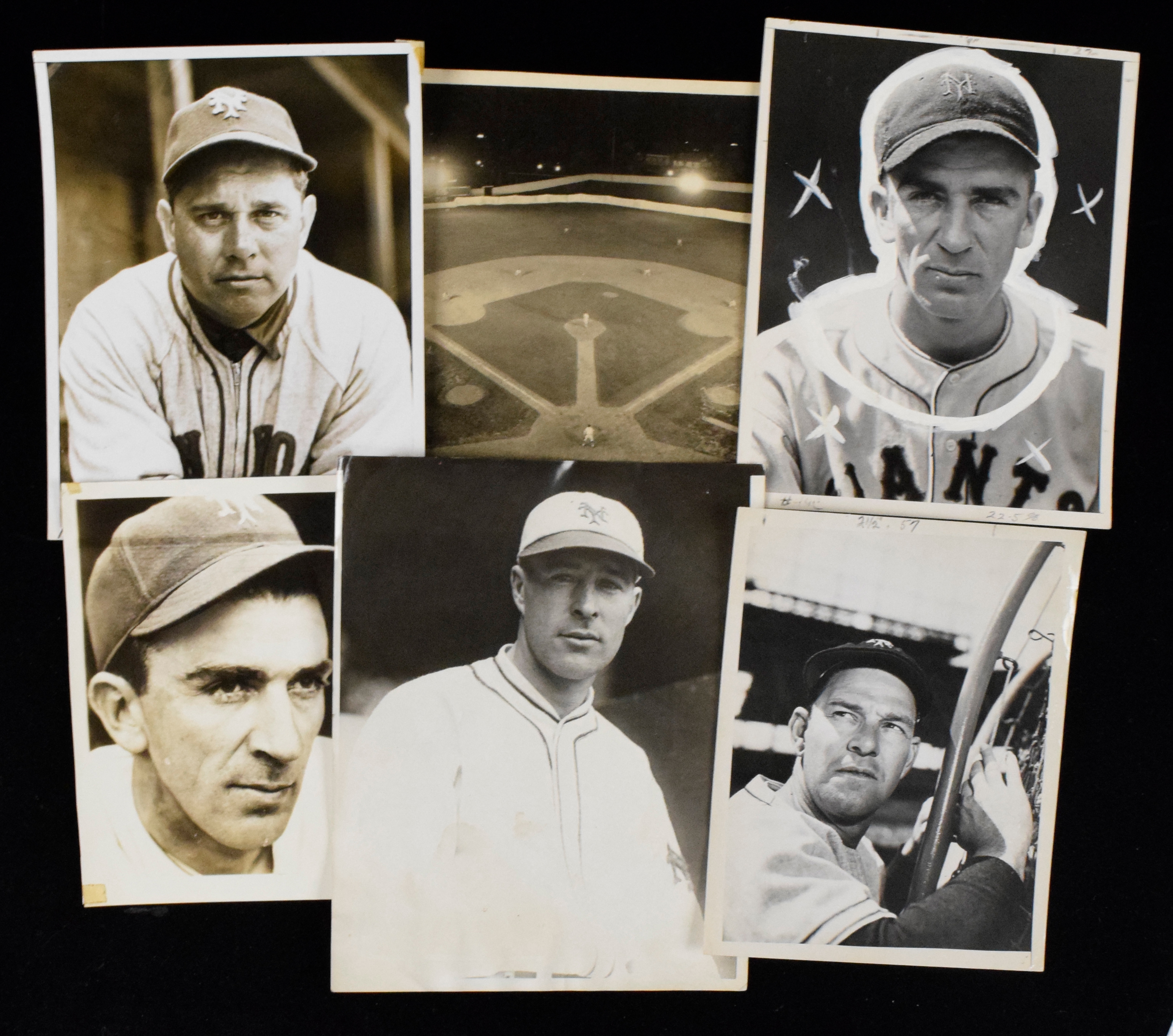 Description:Lot of (17) vintage baseball photographs including HOFers, c.1920s-70s (GD-EX/MT). Includes c.1920s Bill Carrigan photo, c.1926 Art Nehf photo, c.1929 ACME photo picturing Lefty O'Doul, c.1920s-30s Charlie Berry photo, c.1930s Muehlebach Field photo, c.1930s ACME photo picturing Carl Hubbell, c.1930s-40s AP photo picturing Carl Hubbell, c.1941 United Press photo picturing Bill Terry, c.1940s International News Photo picturing Mel Ott, c.1956 Lawrence Stadium photo picturing path of 503-ft Earl Hersh HR, c.1950s-60s Fenway Park photo, c.early 1960s Candlestick Park photo, (2) different c.1960s Tigertown (Lakeland, FL) photos, c.1960s-70s Shea Stadium photo, c.1970s Yankee Stadium photo, and c.1976 UPI photo of Yankee Stadium. Most appear to average VG-VG/EX overall with normal age and handling wear. Range: GD-EX/MT
