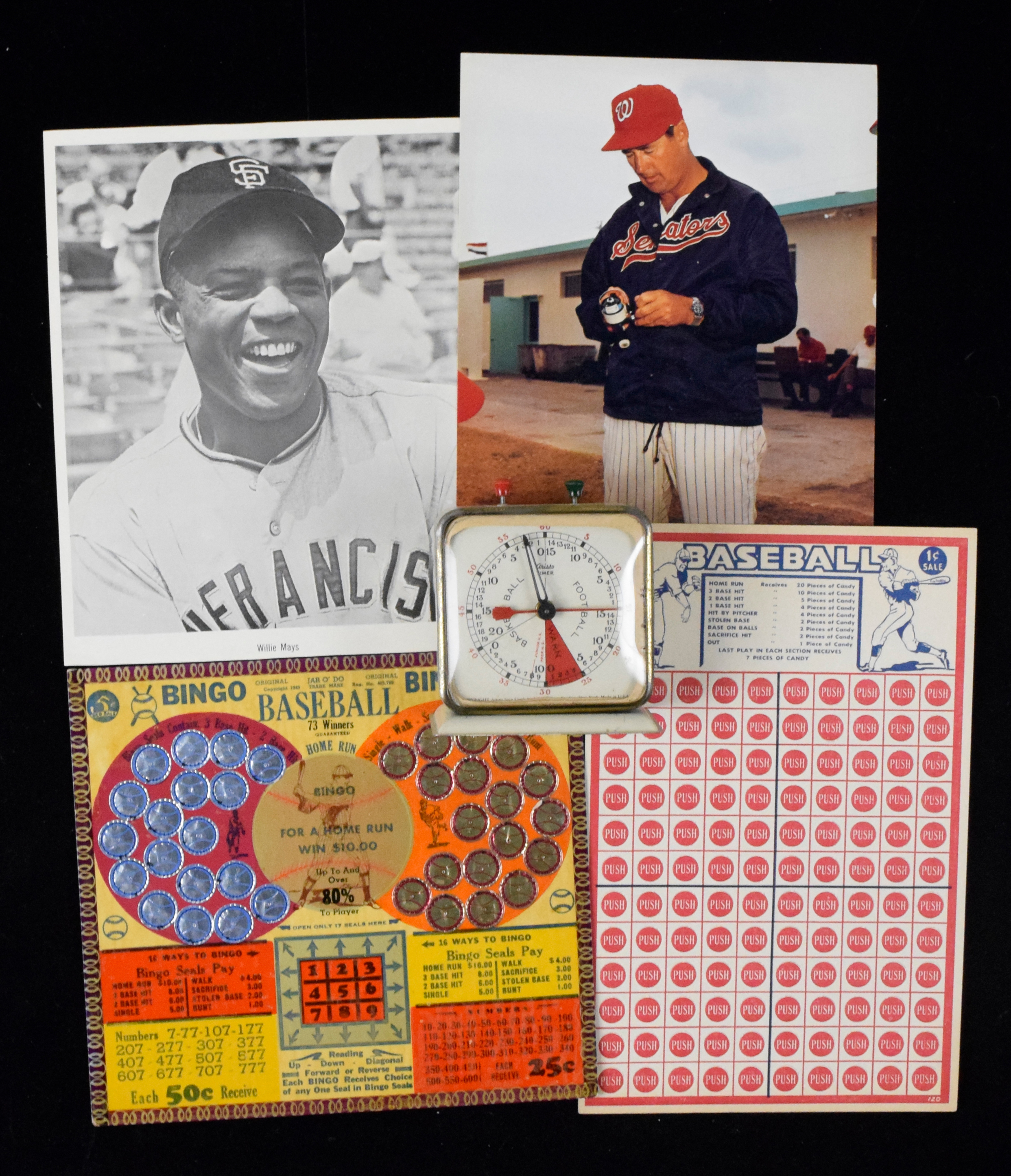 Description:Lot of assorted sports memorabilia & publications from the 1940s-modern (VG-NM/MT). Includes c.1940s 8.5"x9.5" colorful baseball bingo punch board (unused), c.1940s 7.5"x11.25" baseball push board (unused), pair of Dodger brand boxing gloves stamped "U.S. 1949" (VG used), c.1940s-50s sports timer by Aristo, c.1950s Nokona G30 Joe Torpey model baseball glove for right handed thrower (VG used), (3) binders of vintage ads and publication photos cut from various magazines, pair of c.1950s Kingston roller skates, Willie Mays 1960 Sports Pix Premium (NM), 8"x10" c.1969-71 likely Sears premium picturing Ted Williams holding a fishing reel (VG/EX), (4) 1977 Kansas City Royals AL West champs Pepsi / Pizza Hut placemats (used/stained), (15) New York Yankees spring training programs from the late 1990s - 2010s, and (17) Yankees media guides from 2001-2012: VG-NM/MT