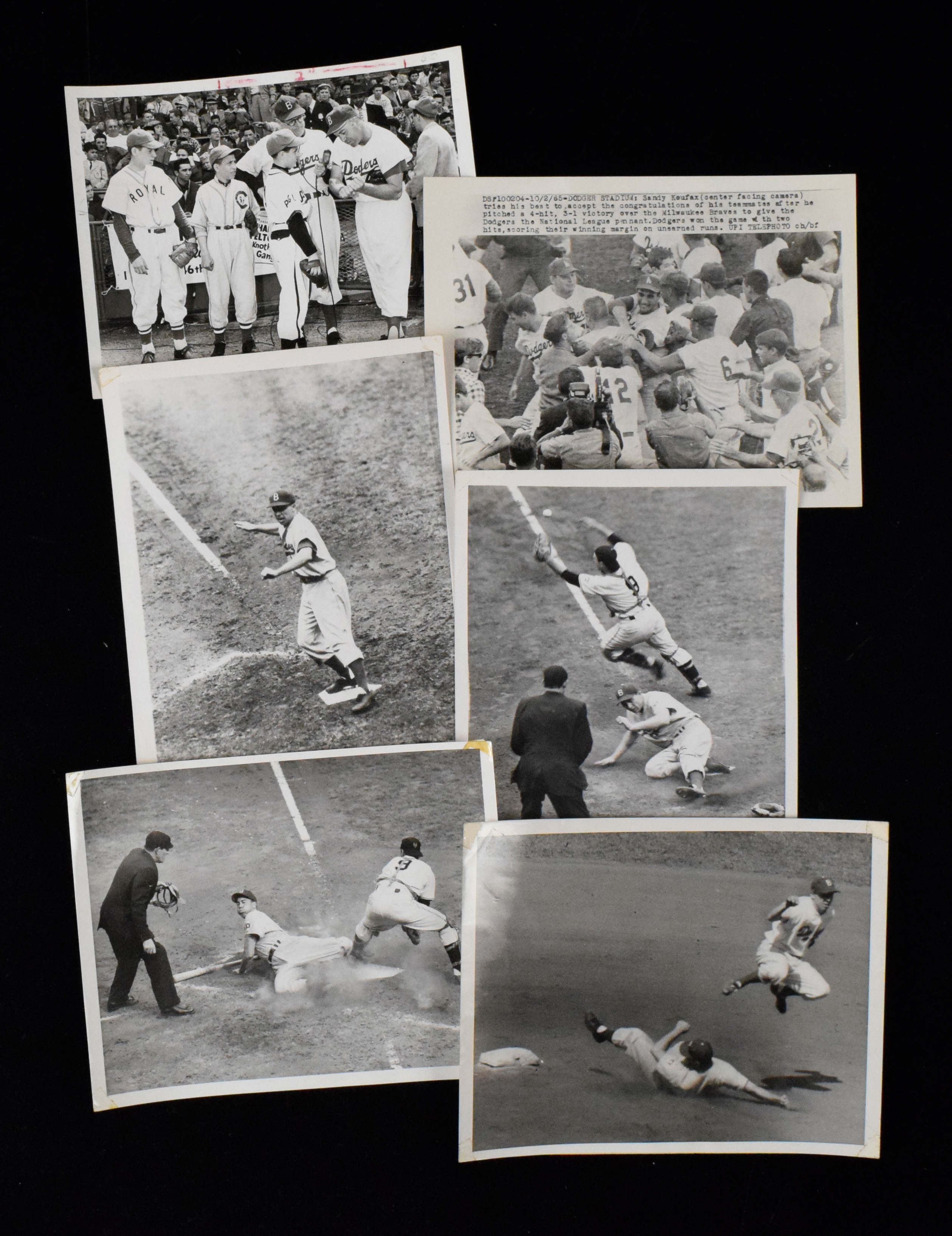 Description:Lot of (9) Dodgers HOFers vintage photographs, c.1951-1965 (VG-EX/MT). Includes c.1951 International News photo picturing Gil Hodges kissing his wife, c.1951 International News photo picturing Pee Wee Reese high in the air turning a double play, c.1951 photo picturing Duke Snider sliding into home plate, c.1951 photo picturing Gil Hodges sliding into home plate, c.1951 photo picturing Pee Wee Reese standing on home plate, c.1951 International News photo picturing Roy Campanella looking at an action photo of himself during a prior game, c.early-mid 1950s Barney Stein photo picturing Duke Snider showing kids out to grip a bat, c.1962 AP photo picturing Don Drysdale falling while fielding a bunt, and c.1965 UPI photo picyturing sandy Koufax being congratulated by teammates after winning the NL pennant. Most appear to average VG/EX overall mainly due to tape stains at the corners. Range: VG-EX/MT