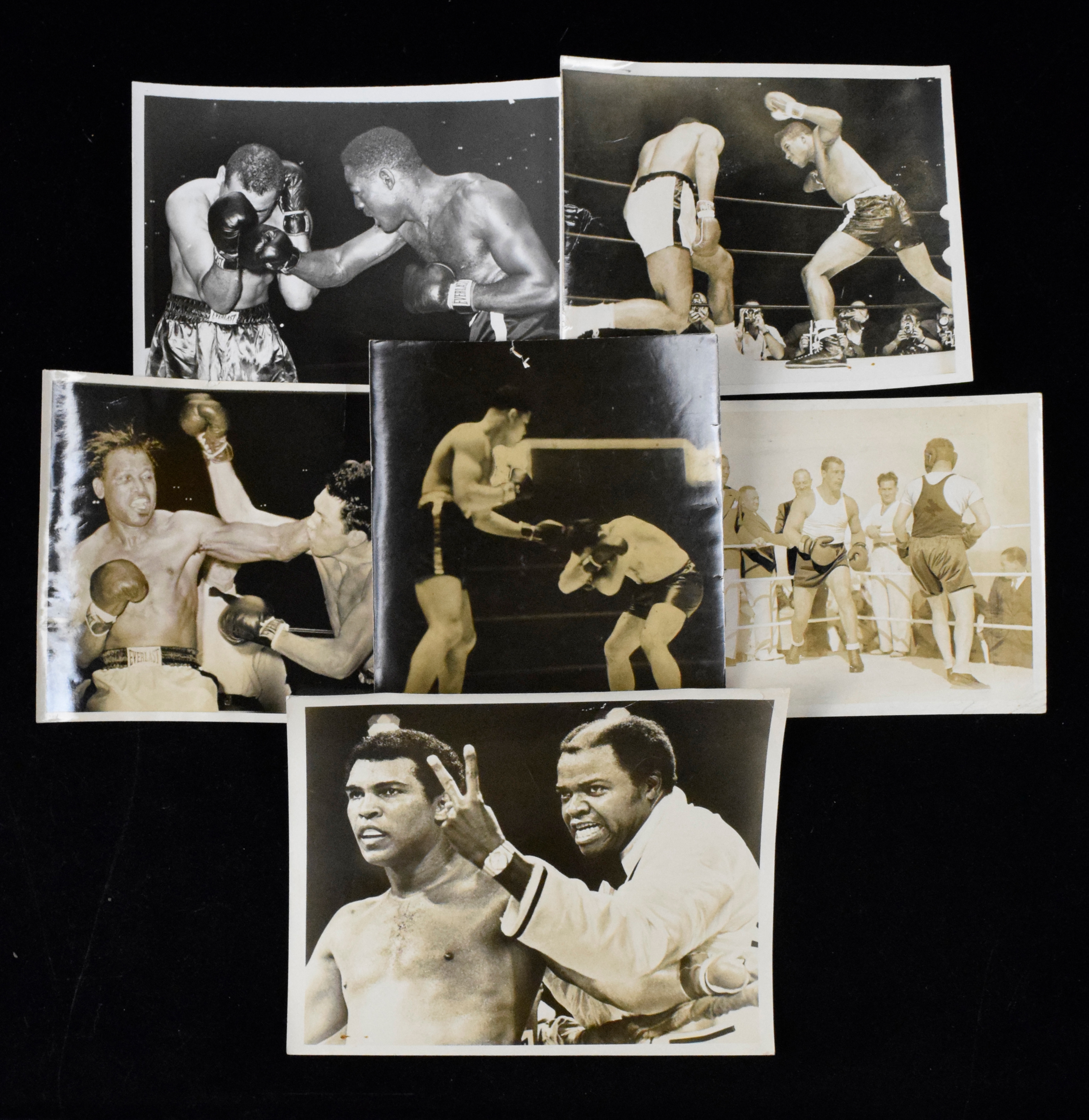 Description:Nice lot of (96) boxing photographs including HOFers, c.1930s-80s (PR-NM). Includes Jim Braddock, Joe Louis, Ezzard Charles, Floyd Patterson, Sugar Ray Leonard, Beau Jack, Kid Gavilan, Cassius Clay / Muhammad Ali, Jake LaMotta, Primo Carnera, Dick Tiger, Joey Giardello, Willie Pep, Emile Griffith, Sugar Ray Robinson, Archie Moore, Barney Ross, Jock McAvoy, Thomas Hearns, Bobo Olson, Randy Turpin, and many others. Various conditions throughout the lot. Most appear to average VG-VG/EX overall with normal age and handling wear. Range: PR-NM