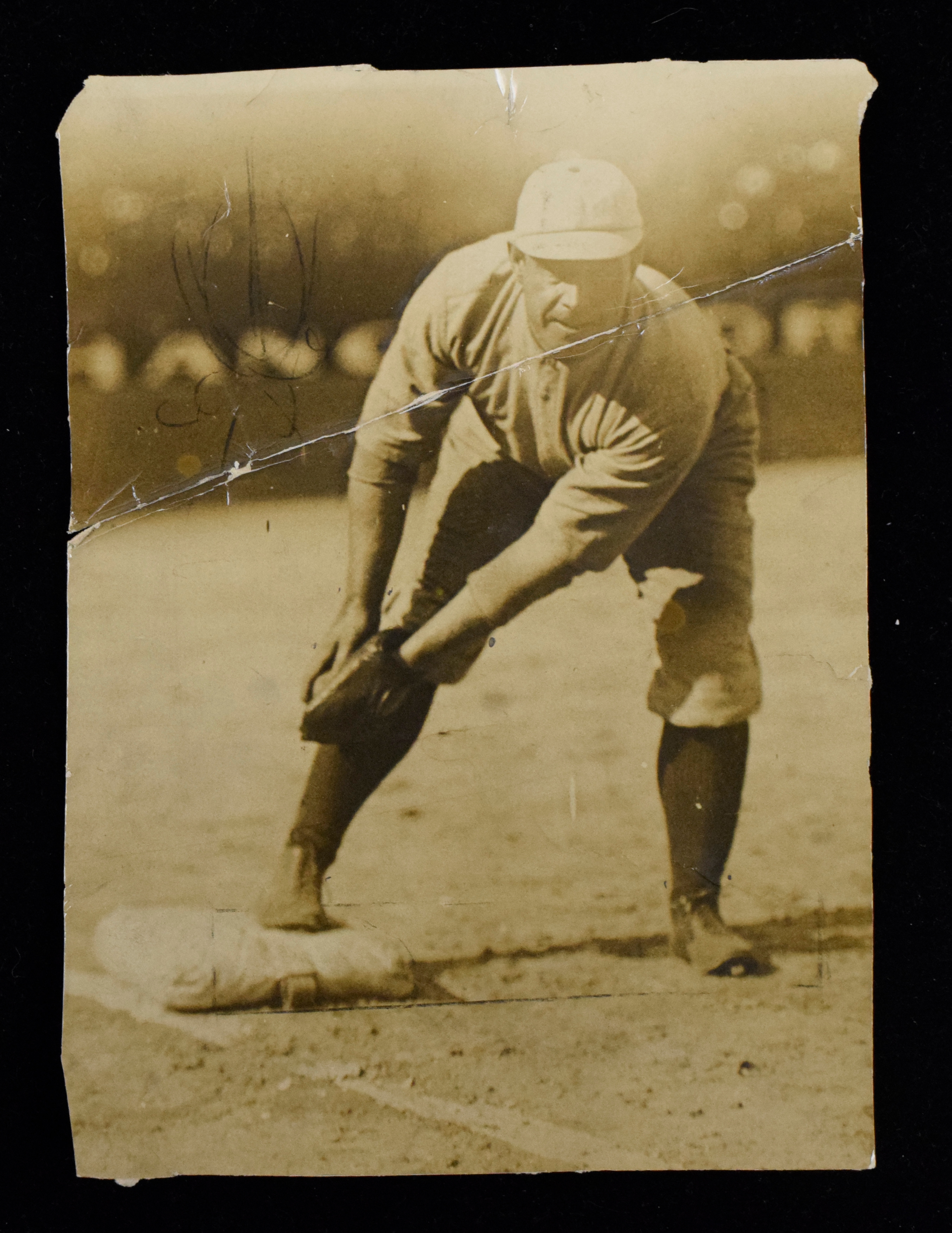 Description:Jimmy Collins photograph, c.1900s (FR/GD). 5"x7" photo picturing Collins fielding at 3rd base. Burke & Atwell photographer stamping is on the back, aling with "Jimmy Collins" "3rd Base" "Boston Red Sox" written identifier. Very heavy crease: FR/GD