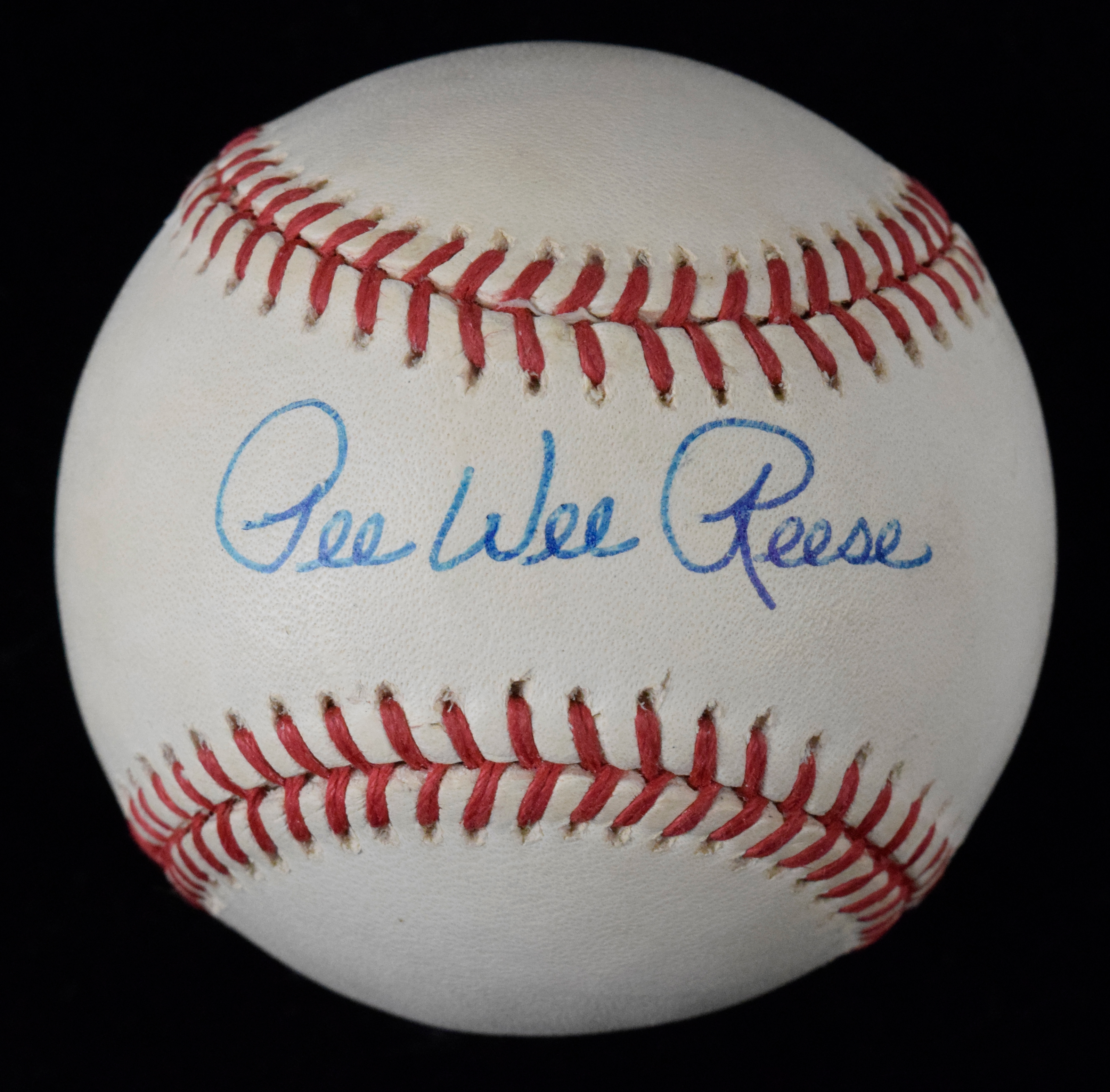 Description:Pee Wee Reese signed W.White NL baseball (EX/MT). Reese signed the sweet spot in blue ink. Signature rates 8/9 out of 10. Minor toning: EX/MT
