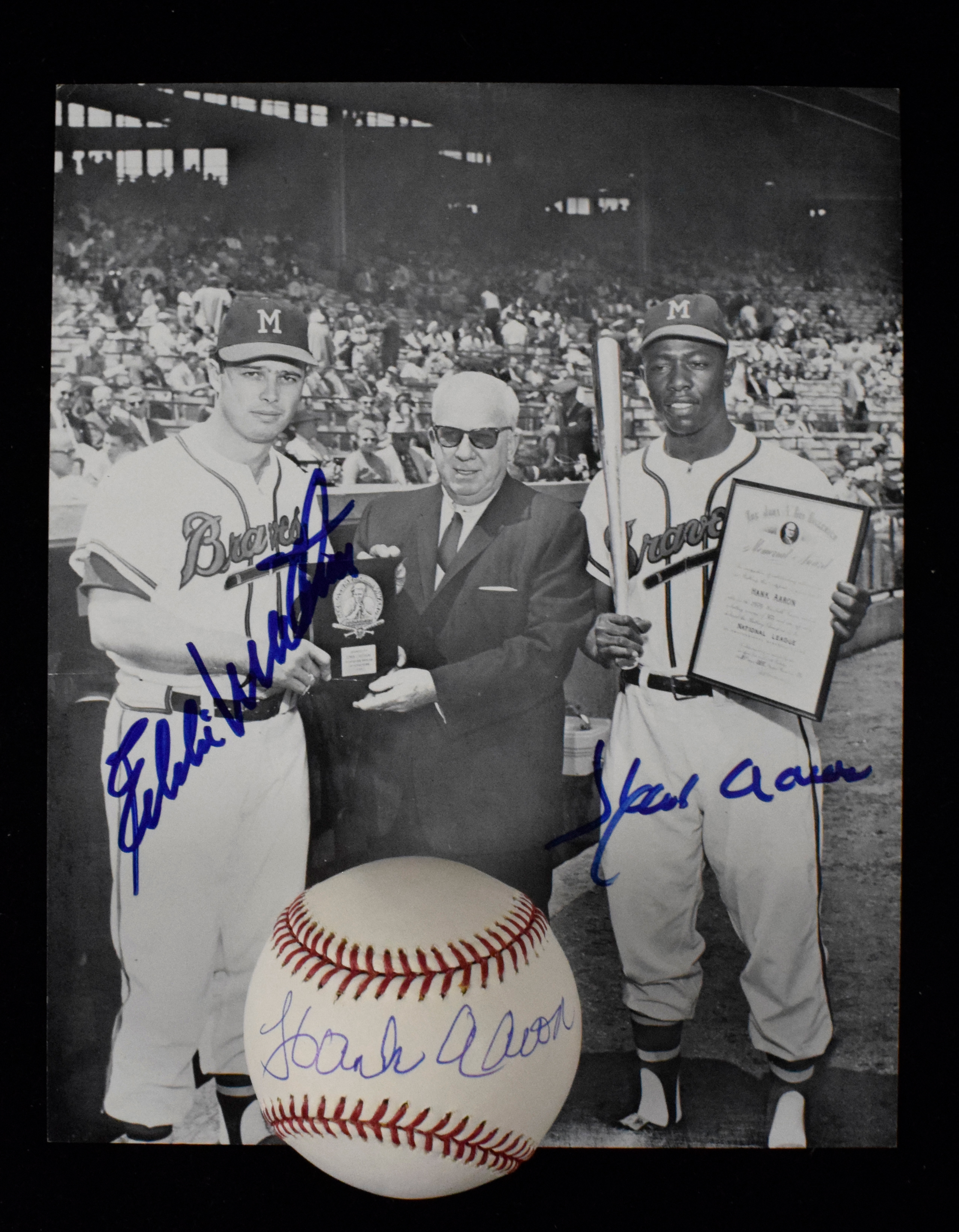 Description:Hank Aaron & Eddie Mathews dual-signed photo plus Hank Aaron signed baseball (EX/MT-NM). Includes 8"x10" photo signed by both Eddie Mathews and Hank Aaron in blue marker, and B.Giamatti NL ball signed by Hank Aaron in blue ink (Steiner). Signatures rate 8/9 to 10 out of 10: EX/MT-NM