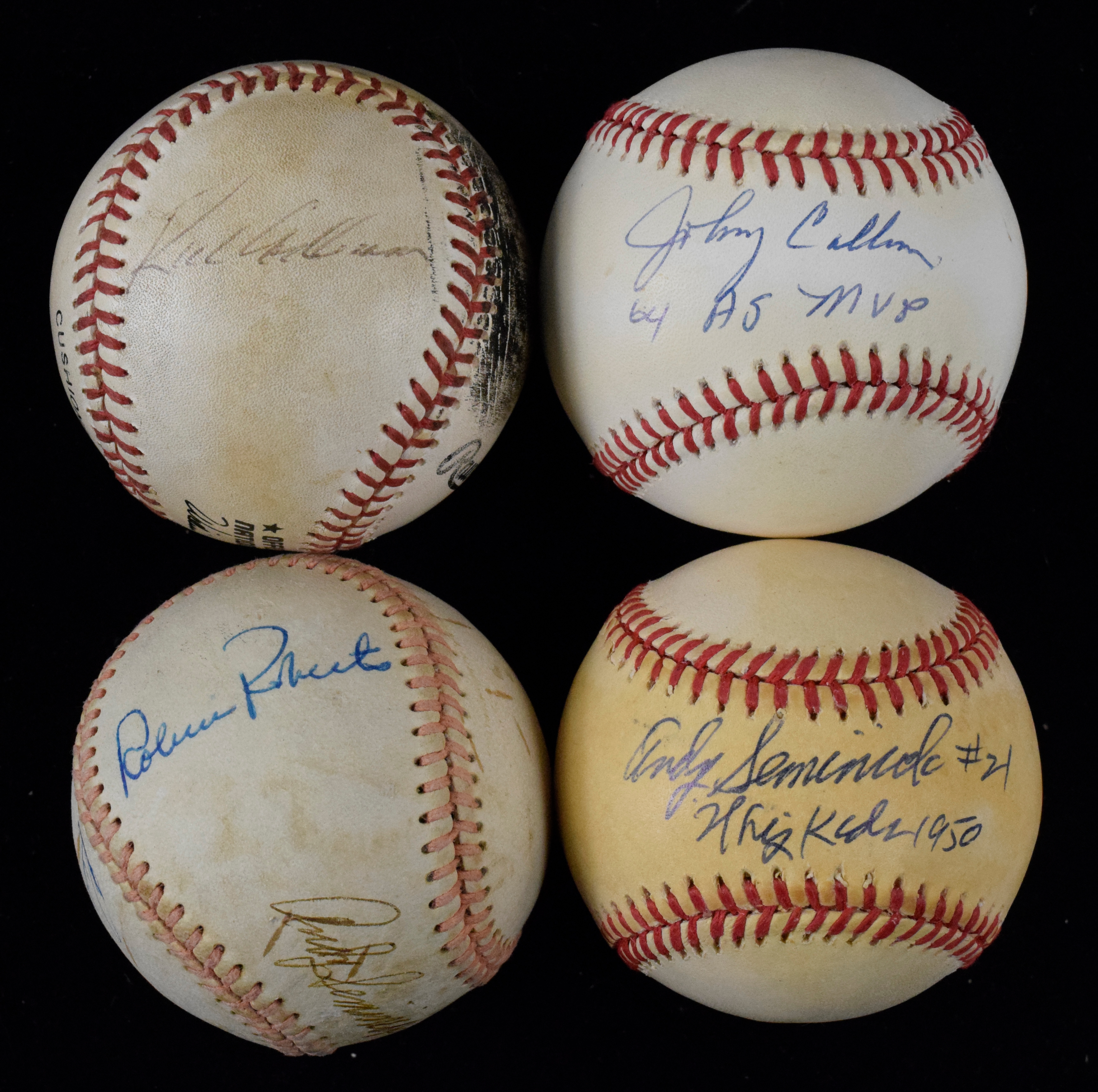 Description:Lot of (11) Philadelphia Phillies signed baseballs (GD-EX/MT). All are signed on official NL, AL, or MLB balls. Single-signed balls include Richie Ashburn (used W.White NL ball), Johnny Callison with "64 AS MVP" inscription, Andy Seminick with "Whiz Kids 1950" inscription, Jimmy Bloodworth, Steve Ridzik with "1950 Whiz Kids" inscription, Jack Mayo with "Phillies" inscription, Bob Miller with "Whiz Kids" inscription, Ruben Amaro (Sr), and Tony Gonzalez. Also includes heavily used ball multi-signed by Richie Ashburn, Robin Roberts, Del Ennis, and Andy Seminick; and C.Feeney NL ball signed by (10): Del Ennis, Chris Short, Von Hayes, Art Mahaffey, Gran Hamner, Bobby Wine, Tom Hutton, Claude Osteen, Tony Gonzalez, and Bud Harrelson. Signatures rate 4/5 (Mayo) to 9 (avg 7) out of 10. Most balls appear to average VG/EX overall due to various degrees of wear and/or toning. Range: GD-EX/MT