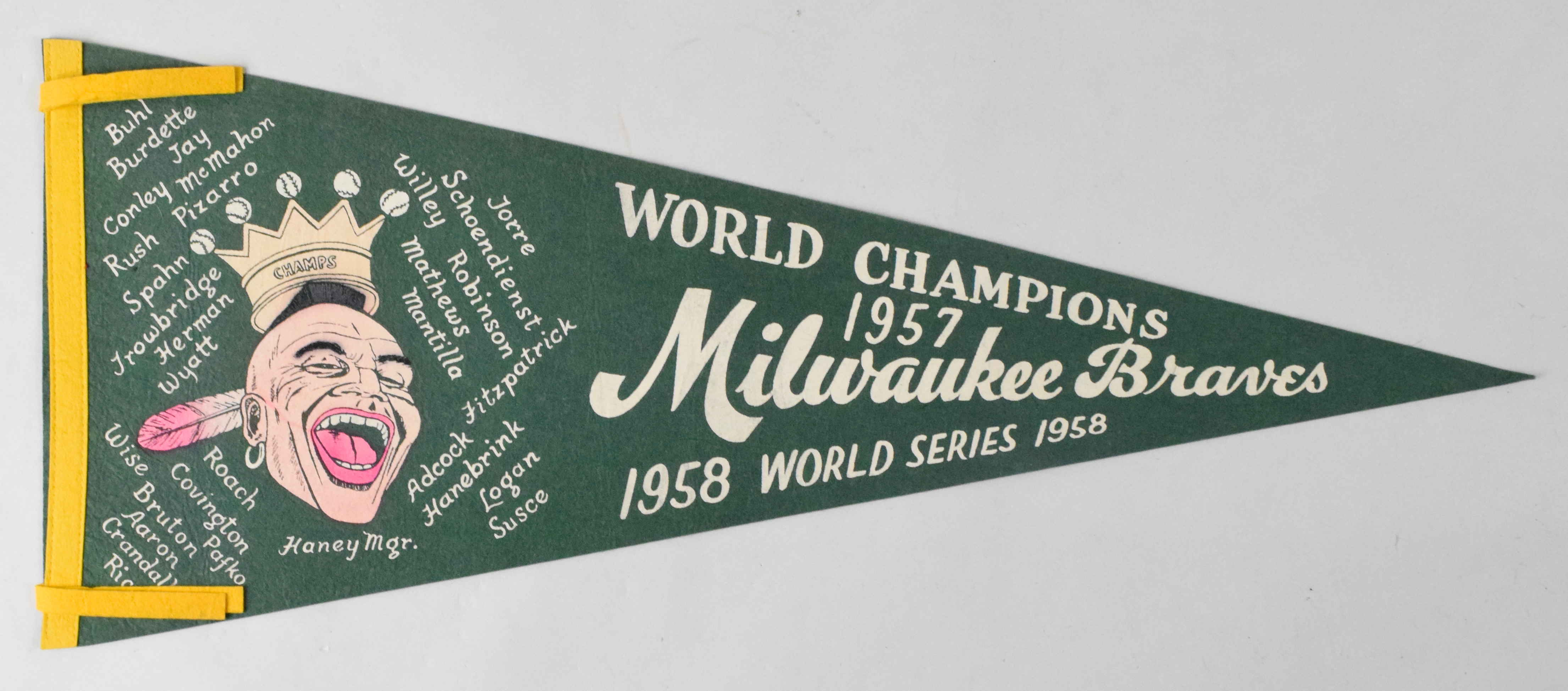 Description:High grade Milwaukee Braves 1958 World Series pennant (NM). 29.5" Braves pennant with names of team members surrounding team logo at the left. Minimal wear: NM