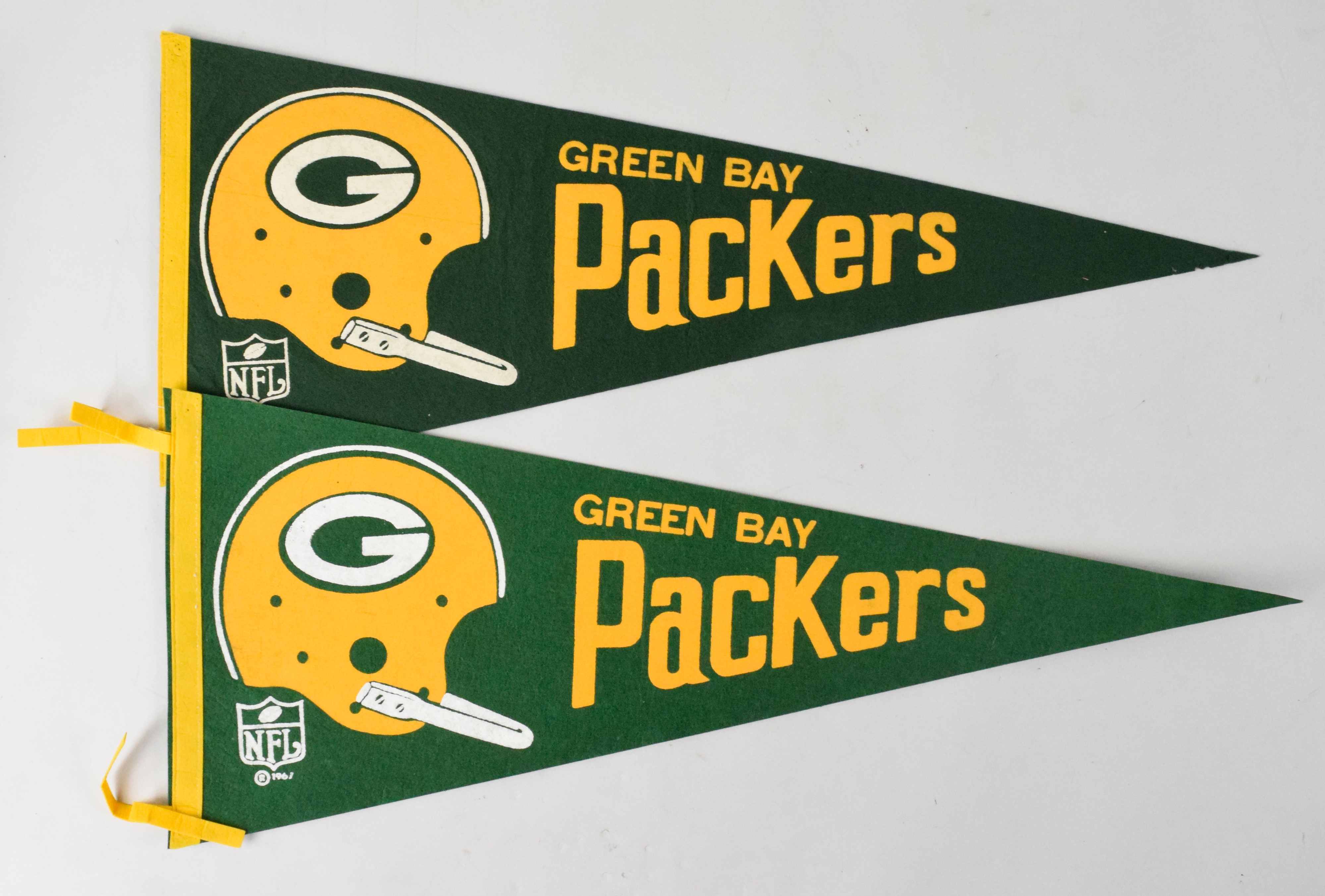 Description:Lot of (2) vintage Green Bay Packers pennants, c.late 1960s (EX-EX/MT). Includes 29.35" Packers pennant with 1967 year below the NFL logo (EX/MT), and 29" Packers pennant without year identified (EX).