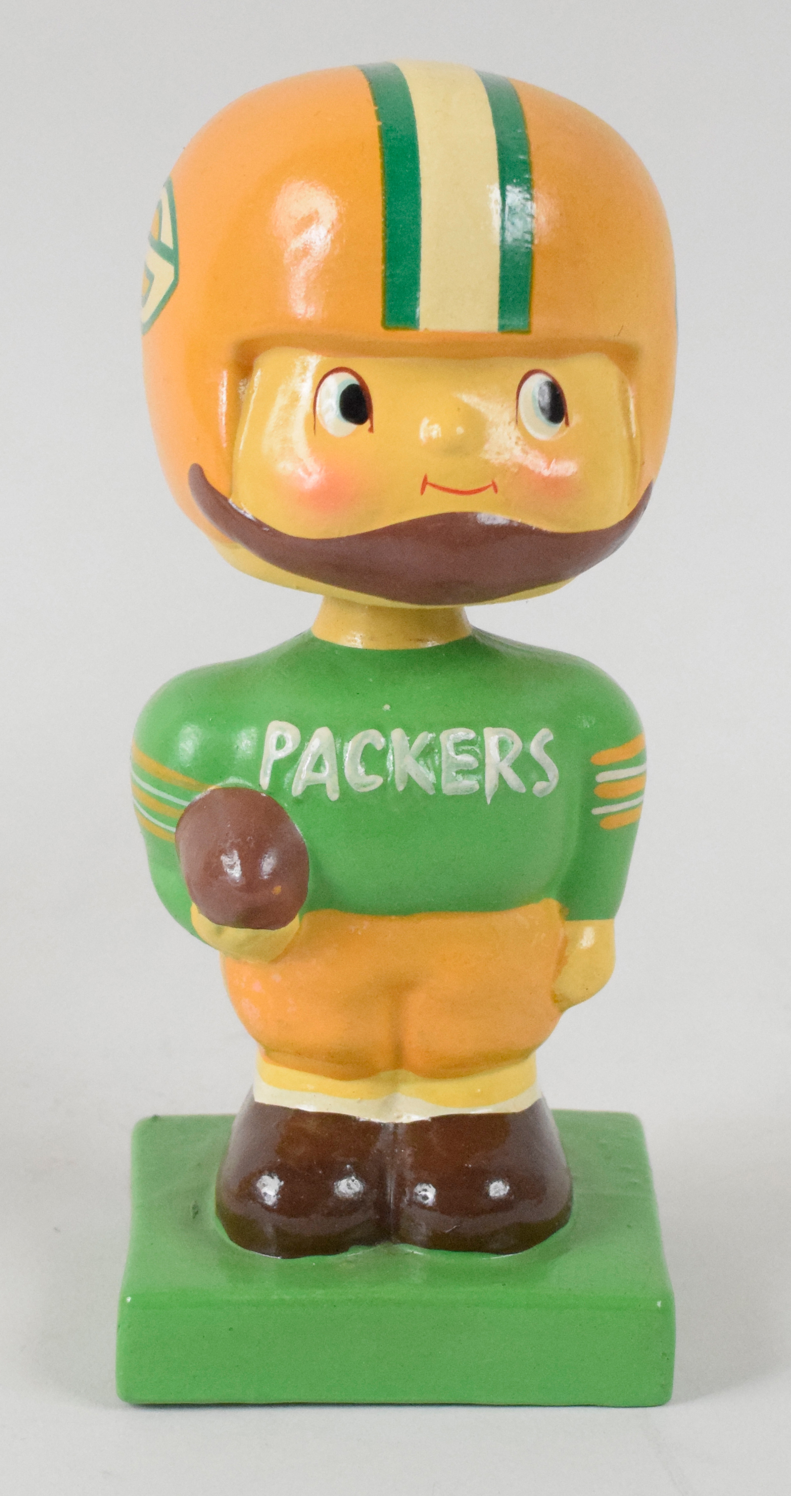 Description:Green Bay Packers vintage nodder, c.1960-61 (NM - no NFL logo variation). Square papier-mache base nodder without NFL logo variation. Minimal wear, with some possible paint touch-ups: NM