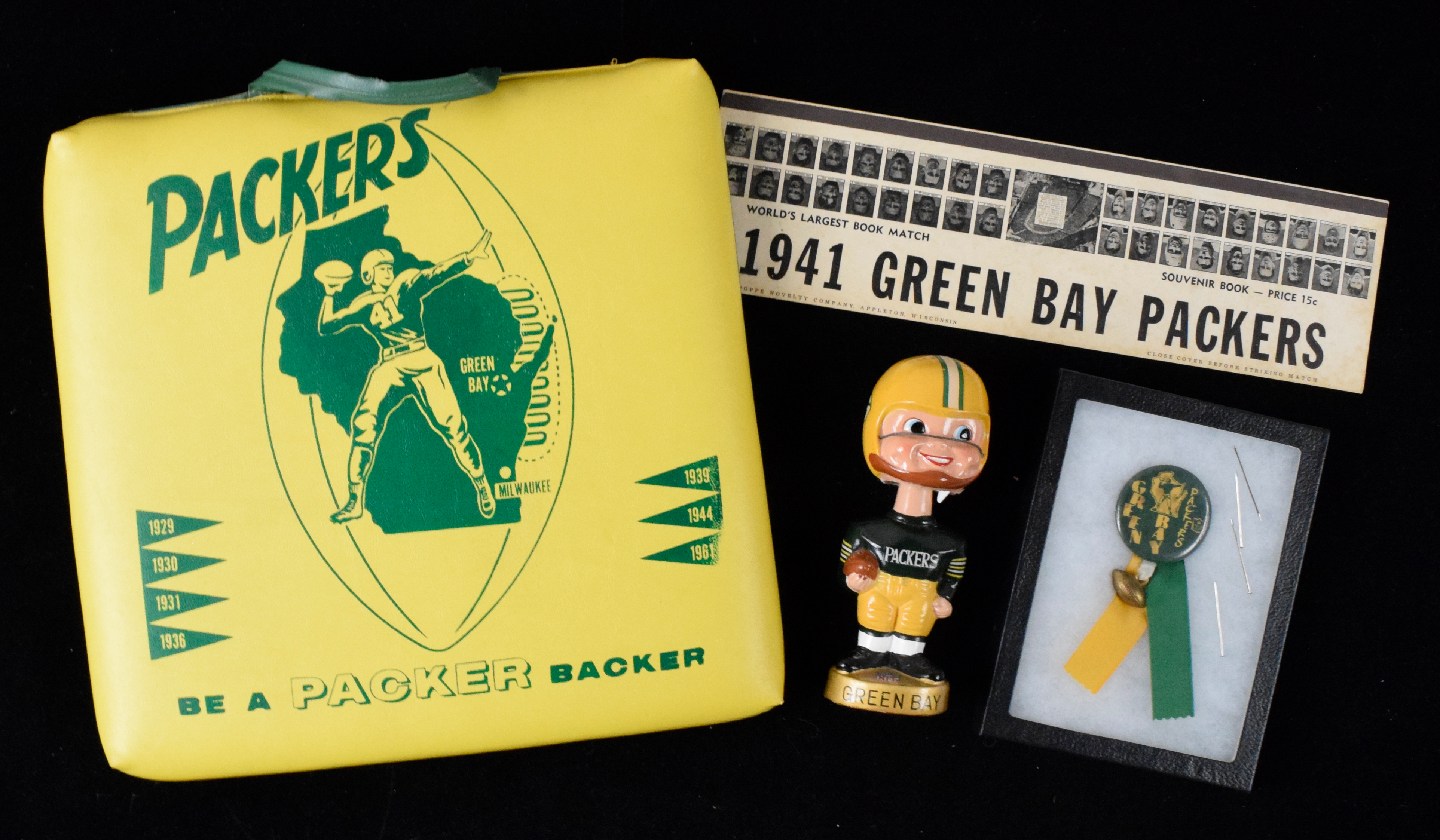 Description:Green Bay Packers vintage memorabilia lot from 1941-1971 (VG-NM). Includes 4.5"x15.5" 1941 Packers matchbook cover (EX age toning, cover portion only); c.1960s Packers pin (VG/EX-EX); c.1962 Packers seat cushion (EX-EX/MT); c.late 1960s Packers nodder (VG due to cracking on back of head but displays much better), and 1971 Packers desk clock (NM not currently ticking).
