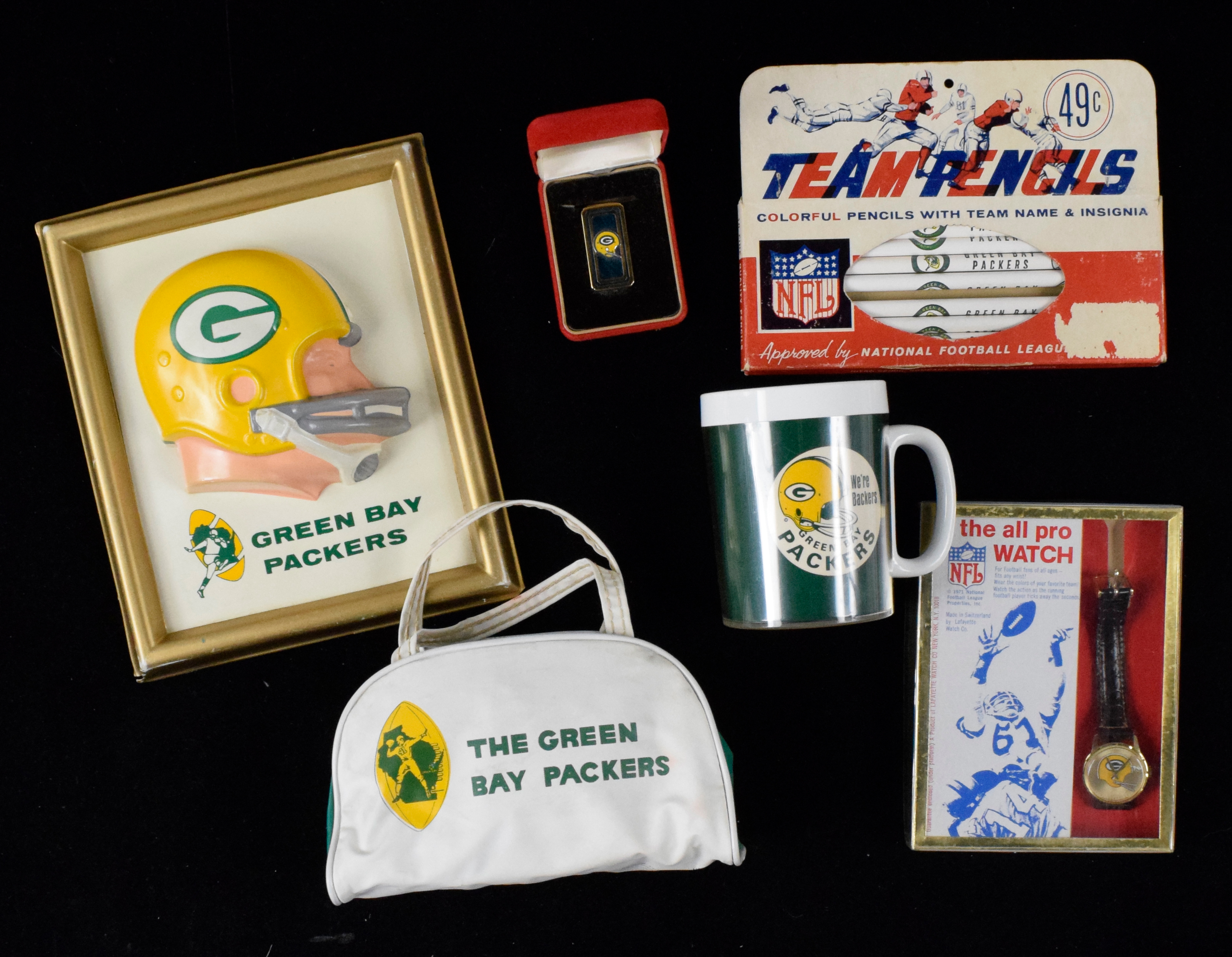 Description:Green Bay Packers vintage memorabilia lot, c.1960s-70s (VG-NM). Includes c.1960s Packers mini handbag (EX); (7) 1961 Packers pencil still in original 10-count store display box (pencils EX/MT-NM, box VG); 7.5"x9" 1965 Packers plastic embossed helmet plaque (VG/EX); c.1960s-70s Packers mug (EX/MT-NM); c.1960s-70s Packers pocket clip (NM); and 1971 Packers watch still in original package (NM).