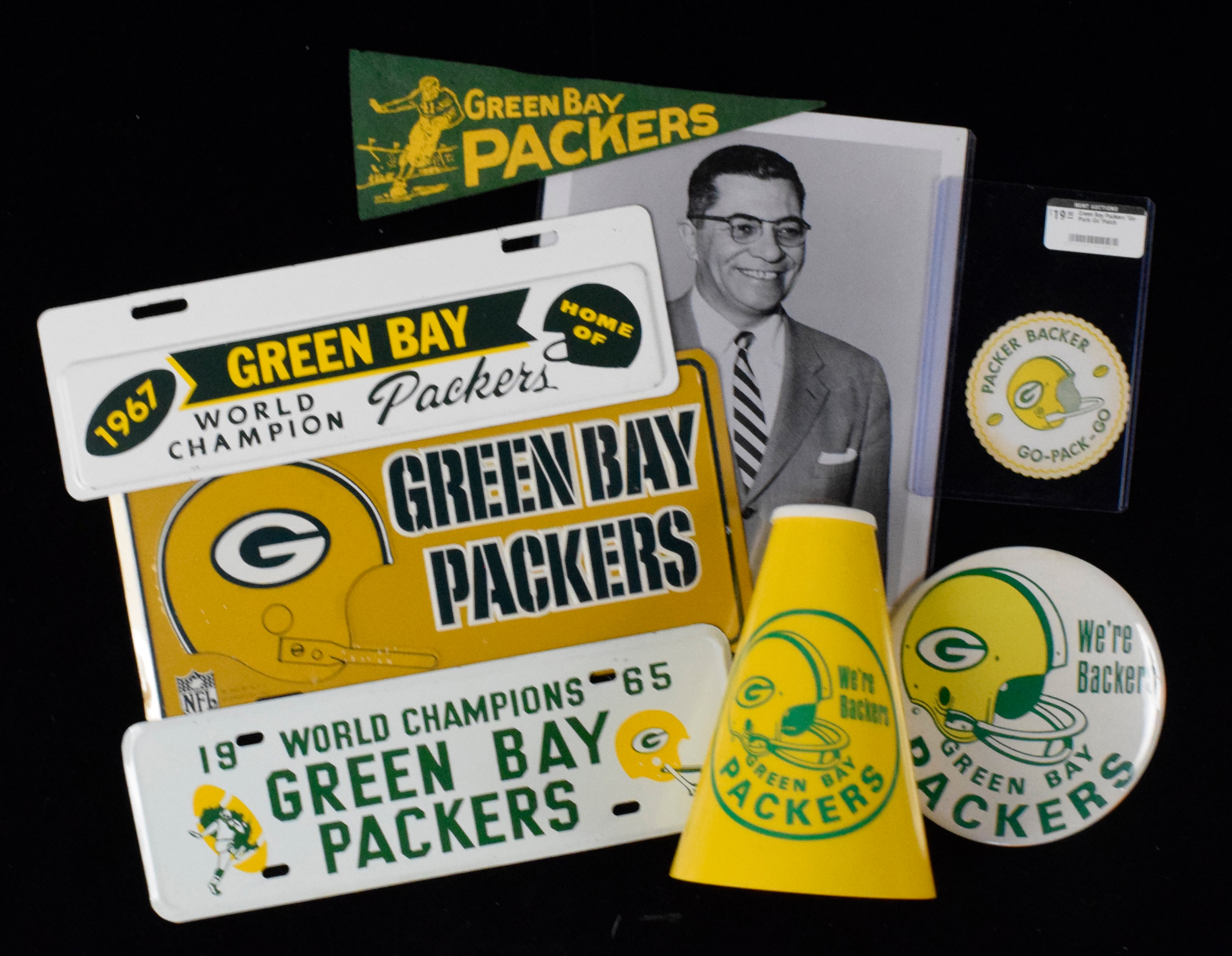 Description:Green Bay Packers vintage memorabilia lot, c.1950s-70s (VG/EX-NM). Includes c.1950s 9" Packers mini pennant (EX), c.1960s 8"x10" Vince Lombardi photo by Lefebvre-Leubke (VG/EX), c.1960s Go-Pack-Go paper coaster (NM), 1965 Packers novelty license plate (NM), Packers 1965 World Champions novelty license plate (EX/MT), Packers 1967 World Champions novelty license plate (EX/MT), c.1960s-70s Packers megaphone (EX/MT-NM), and c.1960s-70s 6" oversize Packers pin (EX/MT-NM).