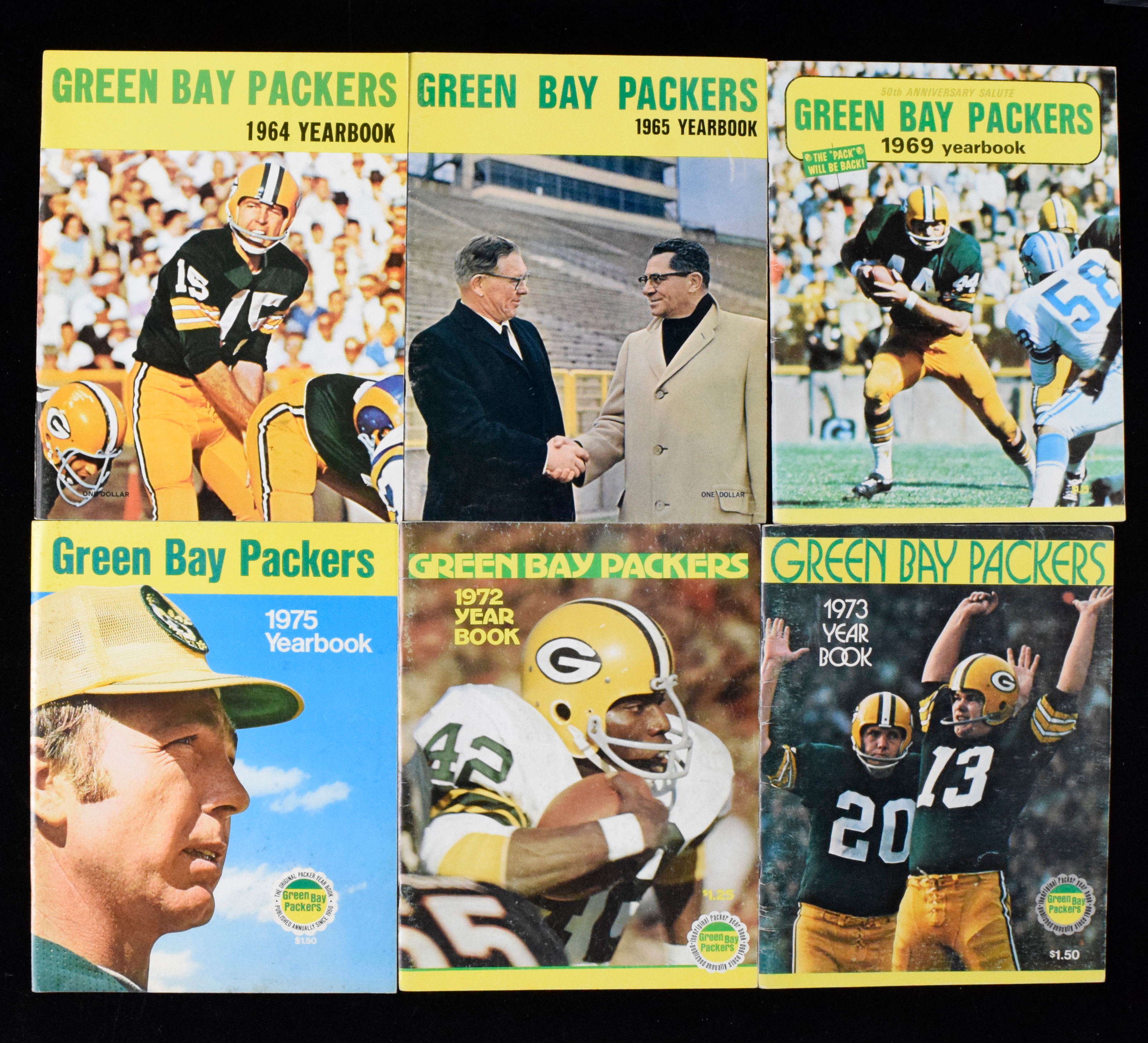 Description:Lot of (7) Green Bay Packers yearbooks from 1964-1976 (VG/EX-EX/MT). Includes 1964, 1965, 1969, 1972, 1973, 1975, and 1976. Most appear to average EX overall with normal handling wear. Range: VG/EX-EX/MT