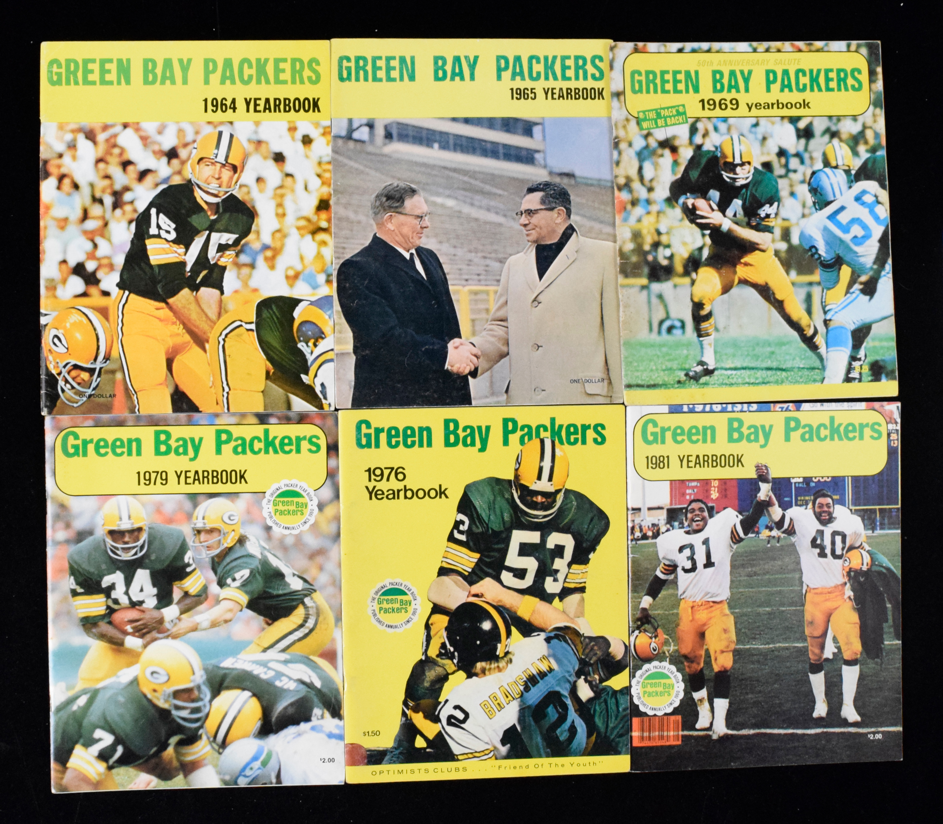 Description:Lot of (40) Green Bay Packers yearbooks from 1964-2015 (VG-NM/MT). Includes (2) 1964, 1965, 1969, (2) 1976, (2) 1977, (4) 1978, 1979, (3) 1980, 1981, (4) 1983, 1993, (6) 2001, 2004, (3) 2007, and (8) 2015. Most appear to average EX/MT overall, but each has not been individually examined page by page. Range: VG-NM/MT