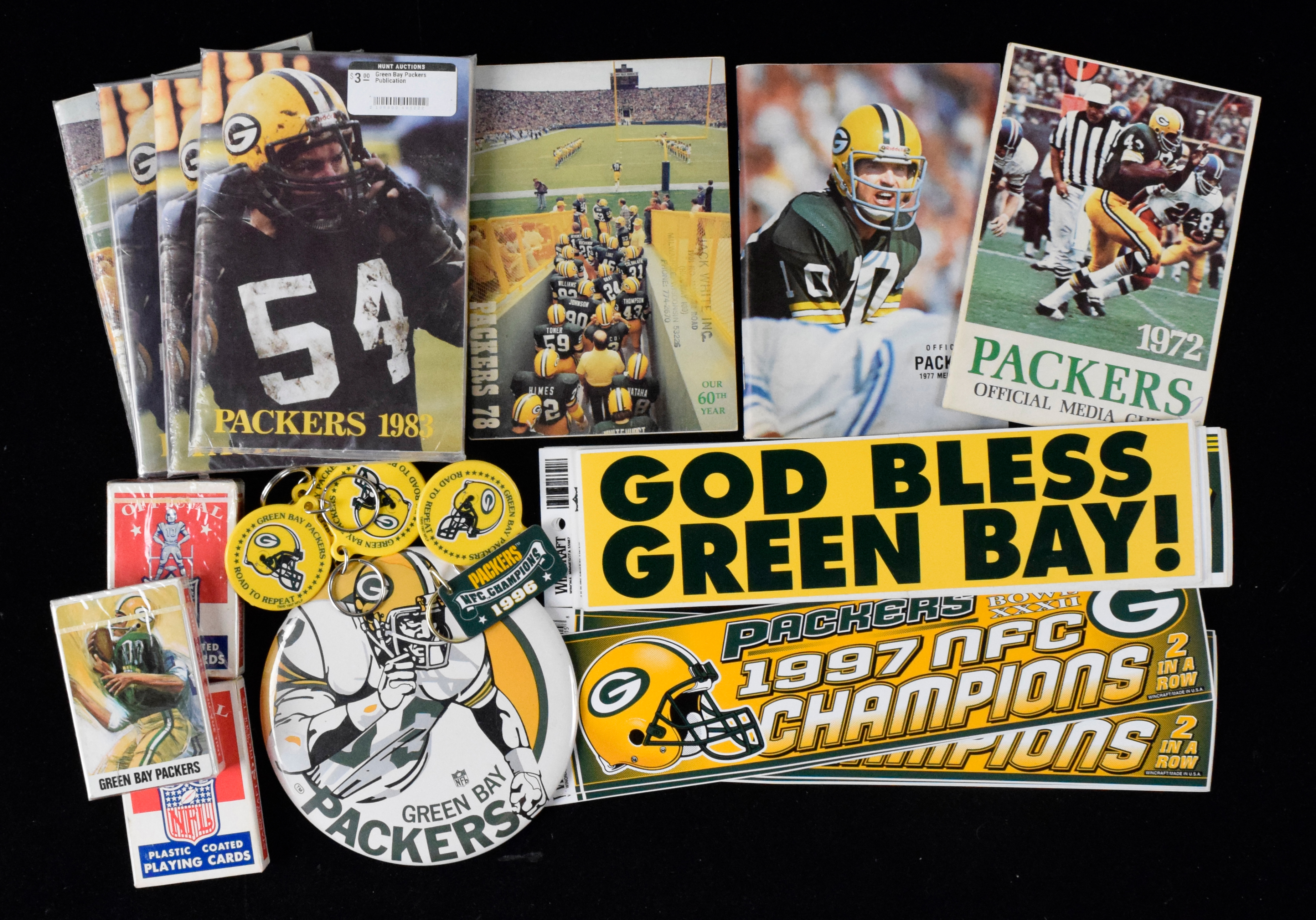 Description:Lot of assorted Green Bay Packer memorabilia (EX-NM/MT). Includes (5) c.1960s-70s Stancraft boxed sets of Packers playing cards, (19) Packers media guides from 1972-1998 (duplication), c.1980s-90s 6" oversize Packers pin, 1.25" stack of Packers bumper stickers, 1996 NFC Champions keychain, and (5) 1997 schedule keychains: EX-NM/MT