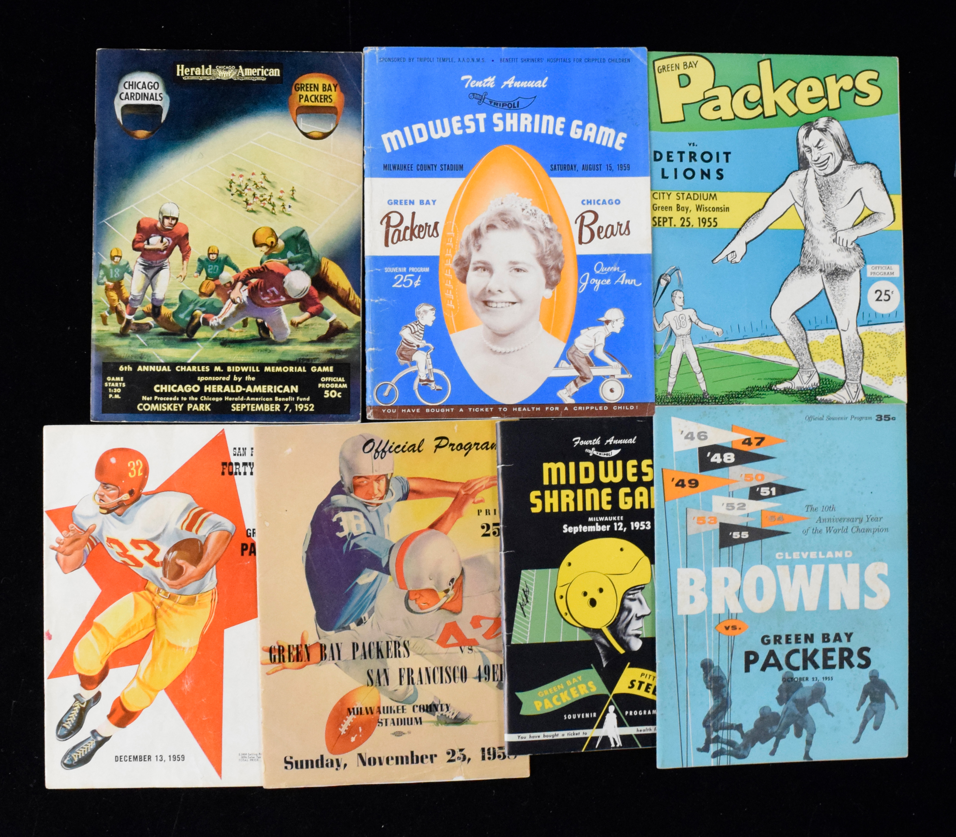 Description:Lot of (7) Green Bay Packers programs from 1952-1959 including Lombardi's 1st game (GD-EX). Includes 9/7/1952 at Chicago Cardinals (VG/EX), 9/12/1953 vs Pittsburgh Steelers (VG-VG/EX), 9/25/1955 vs Detroit Lions (EX), 10/23/1955 at Cleveland Browns (VG), 11/23/1958 vs San Francisco 49ers (GD-G/VG), 8/15/1959 vs Chicago Bears (VG - Vince Lombardi's first game as head coach), and 12/13/1959 at 49ers (VG/EX-EX).